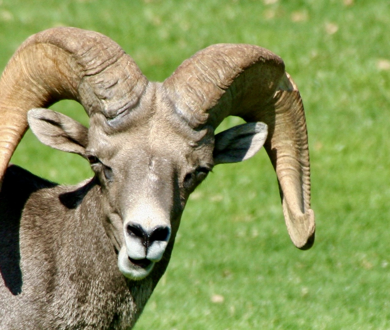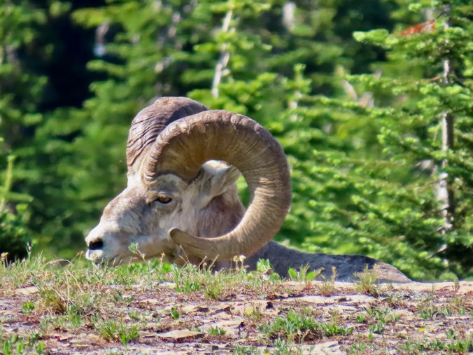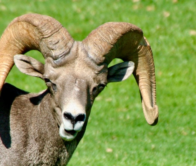 There’s a fun story here. The big ram above had been bringing his flock down to the park from the mountains for years when a new subdivision was built beside the trail. This didn’t seem to bother the big horns and you can imagine what a treat it was for the people. But then, one of the home owners put a shiny aluminum door on his garage next to the trail. The leader looked over and saw his reflection. Except it wasn’t his reflection in his mind. It was another lage male challenging him for the leadership. He reared back and charged at the same time the other big horn did, again and again. Nobody was going to get his nannies. The story the locals told us was that the owner of the garage door had a really hard time convincing his insurance agent how the damage had been caused!
