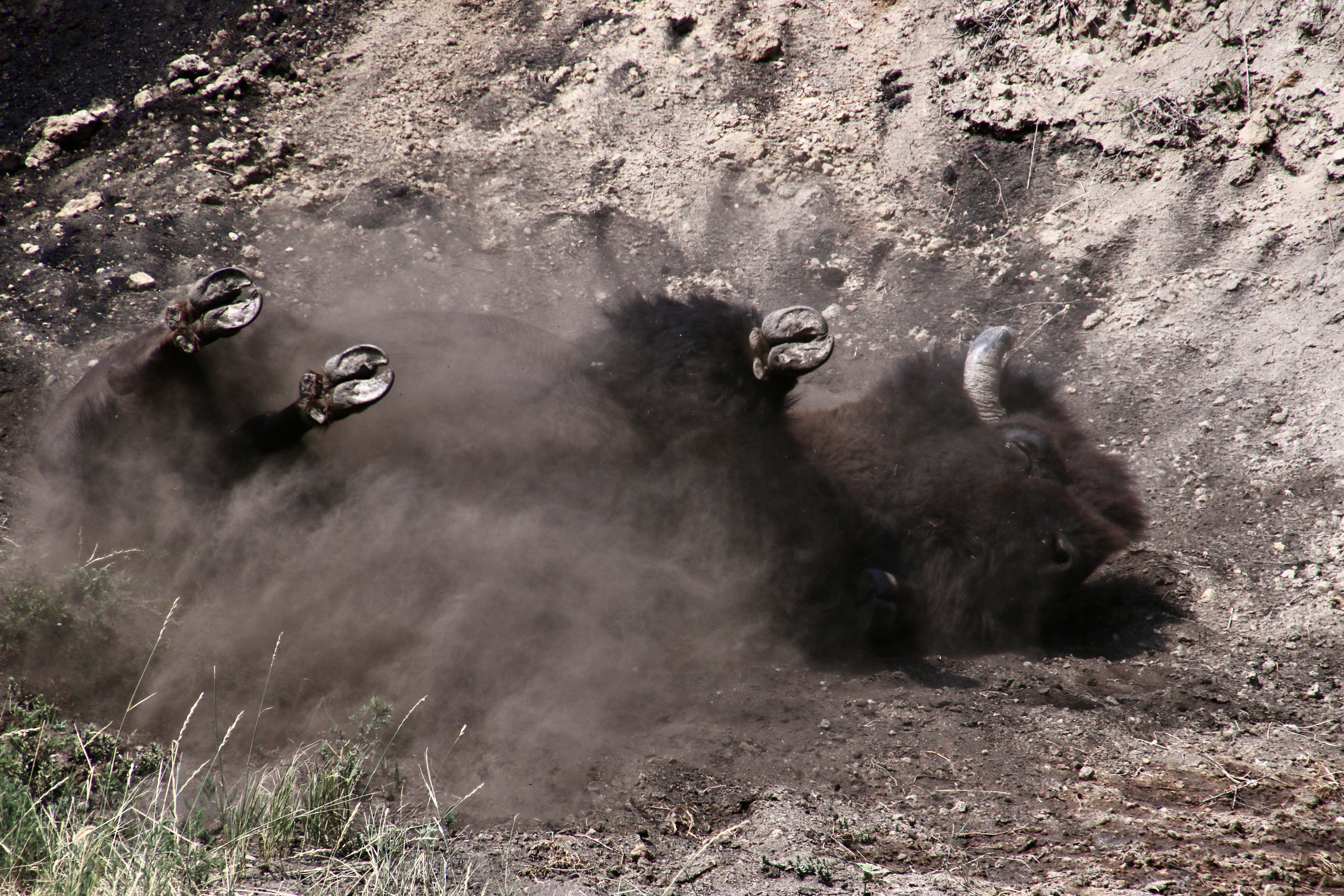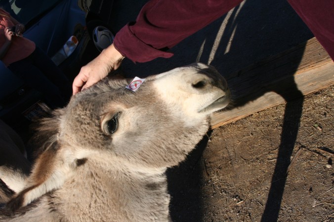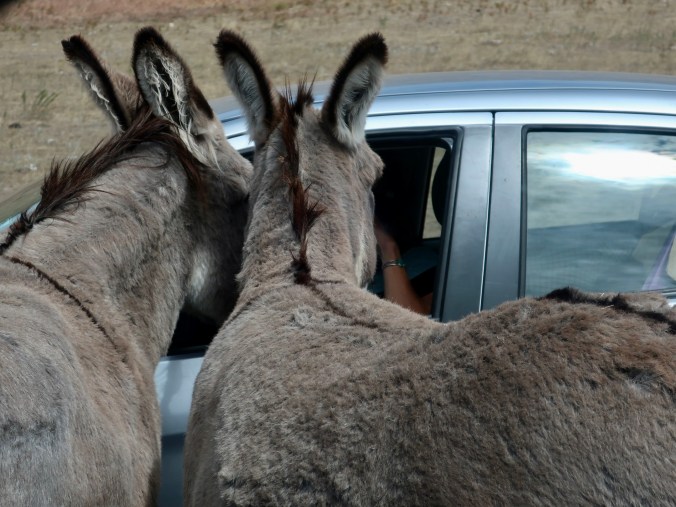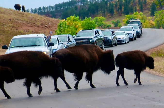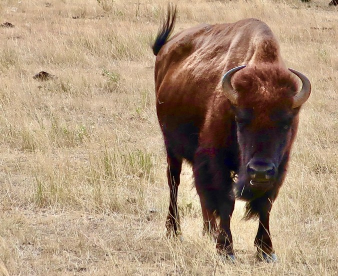A big horned sheep at Glacier National Park.This young big horn sheep was standing beside the Alaska Highway in Canada’s Yukon Territory.Buffalo are another two toed ungulate. This sign was located in a store in Custer, South Dakota. We were on our way to Custer State Park. It’s good advice.If a buffalo stares at you, raises its tail, paws the ground and grunts, you are too close! It’s best to stay at least 75 yards away. Farther if there are calves around. This youngster was feeling its oats even though I was using my telephoto lens from a safe distance. The family of buffalo was crossing the road in Custer State Park. We waited patiently and took photos from the safety of our truck.Have you ever wondered how buffalo create their buffalo wallows? We caught this one wallowing away and taking a dust bath in Theodore Roosevelt National Park in North Dakota. It provides a good look at a two toed ungulate.I’ll close this post with what are our favorite one toed ungulates: Donkeys. This beauty was standing in a shed in Germany’s Black Forest.There were more than buffalo stopping cars at Custer State Park, South Dakota These two answered the age old question of how many donkeys can stuff their heads in a car’s window at one time.This donkey foal was obviously enjoying having its head scratched in Oatman, Arizona— but not nearly as much as Peggy was enjoying doing the scratching! The sticker on its head was put there to discourage people from feeding the youngsters carrots. They can choke on them.And finally, this is me petting a donkey in a field near my house in the early 50s. The lumber stacks in the background are at Caldor Lumber Company in Diamond Springs, California where my dad worked as an electrician. I may have been holding something to feed the donkey.