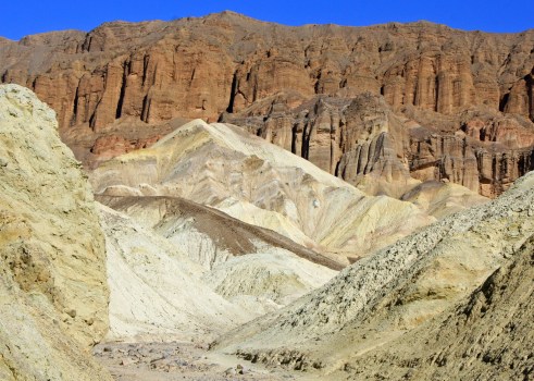 The lower rocks provide a clear view of how Golden Canyon obtained its name. The upper rocks show sedimentary layers of rocks that were once laid down in ancient sea beds and have since been raised and folded by tectonic forces.