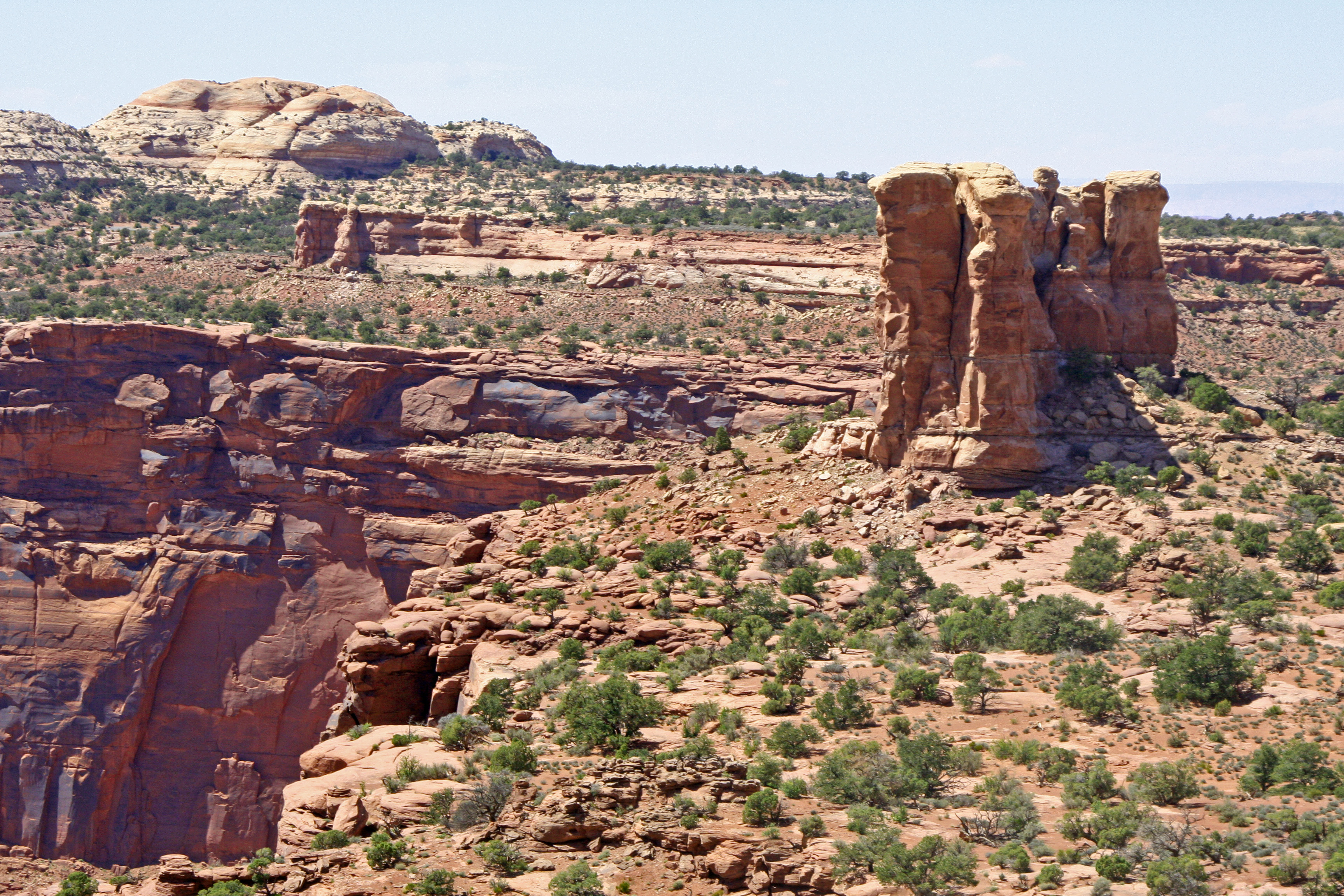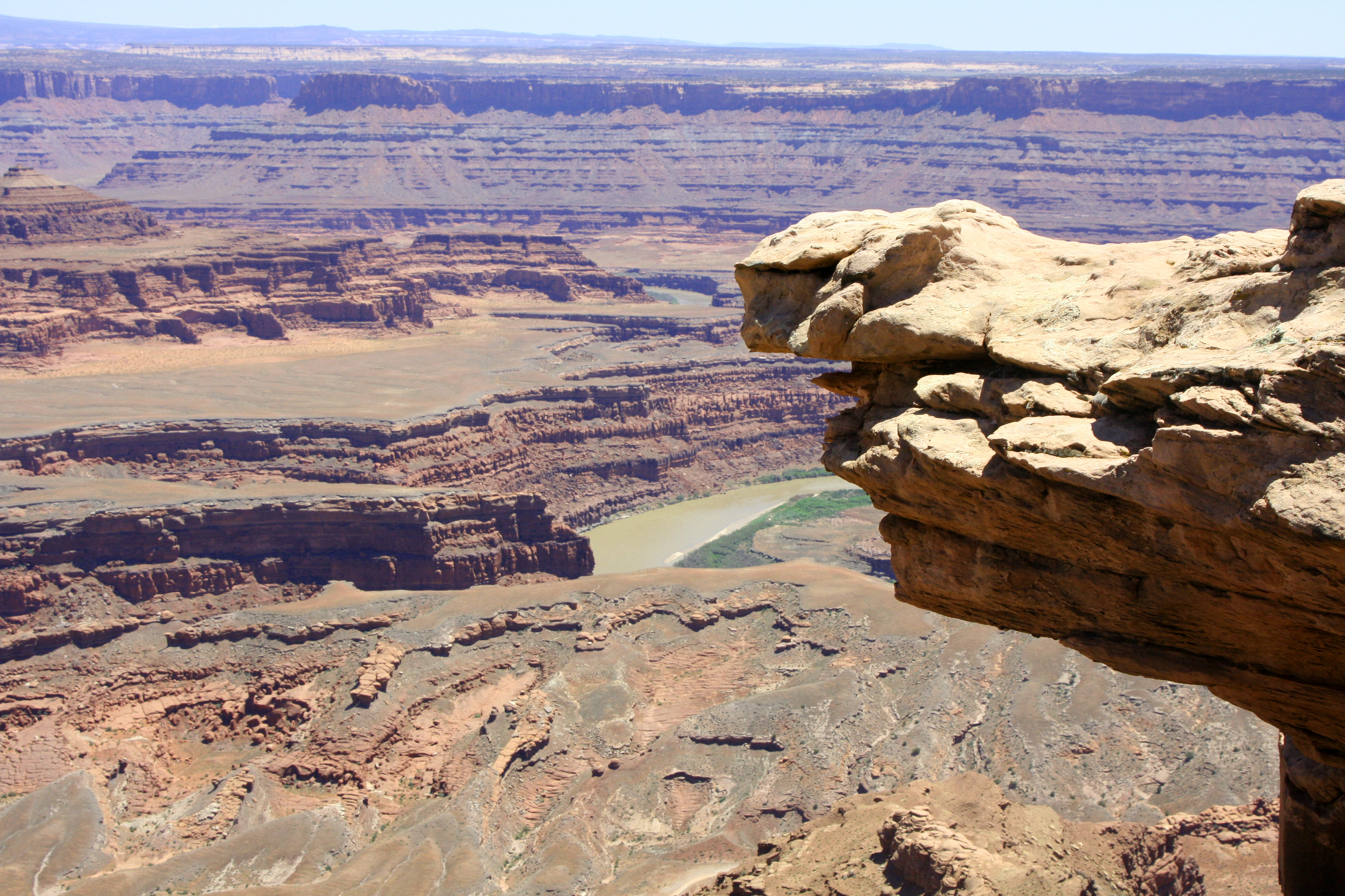 A trip out the park road to Island in the Sky provides views of both basins and other prominent park features. A detour to Dead Horse Point State Park off of the main road shows the Colorado River doubling back and almost meeting itself in a major meander known as the Gooseneck.