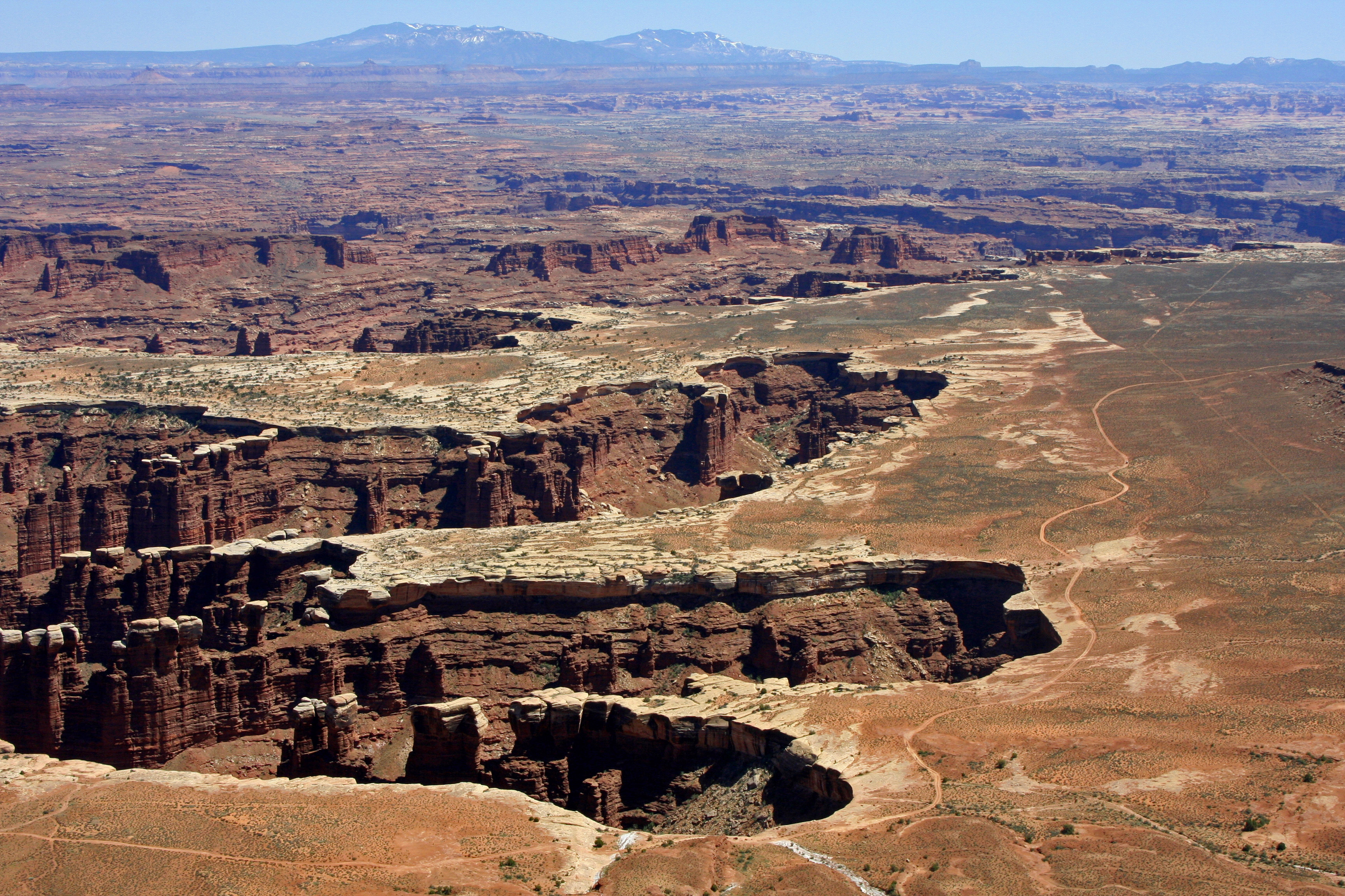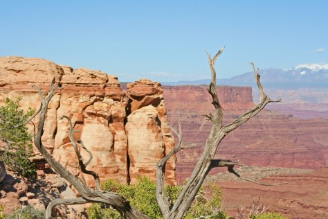 Distant snow-covered mountains, multi-colored rock cliffs, deep canyons and picturesque trees are all part of the Canyonlands National Park scenery.