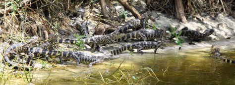 The protective coloration of these young alligators makes them difficult to see. Mom is hiding out near by on guard duty against predators.