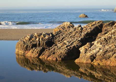 Beautiful weather and early morning sunlight combined for this reflection photo of a rock jutting out toward the Pacific Ocean at Harris Beach State Park just north of Brookings, Oregon where I was camping this week.