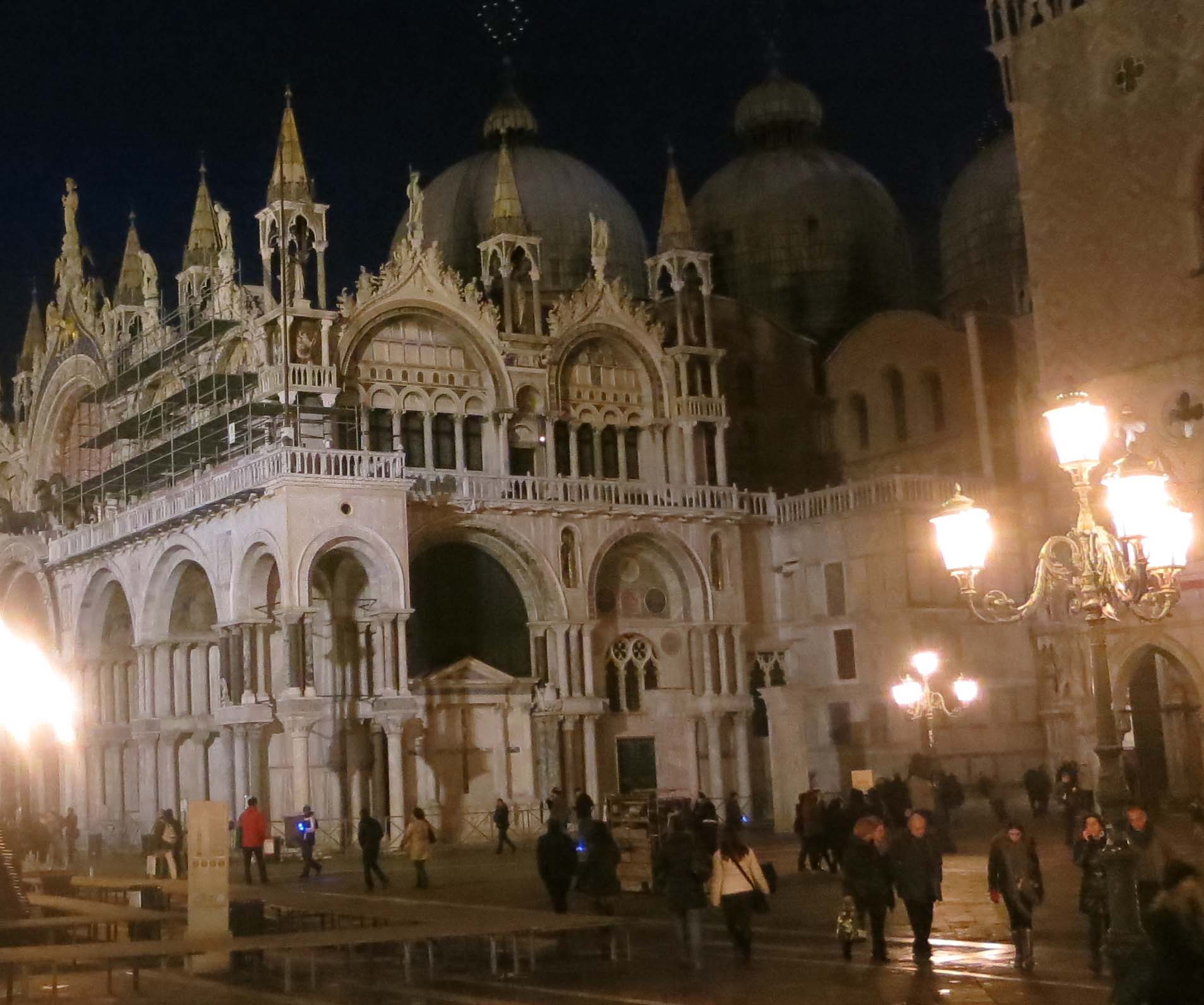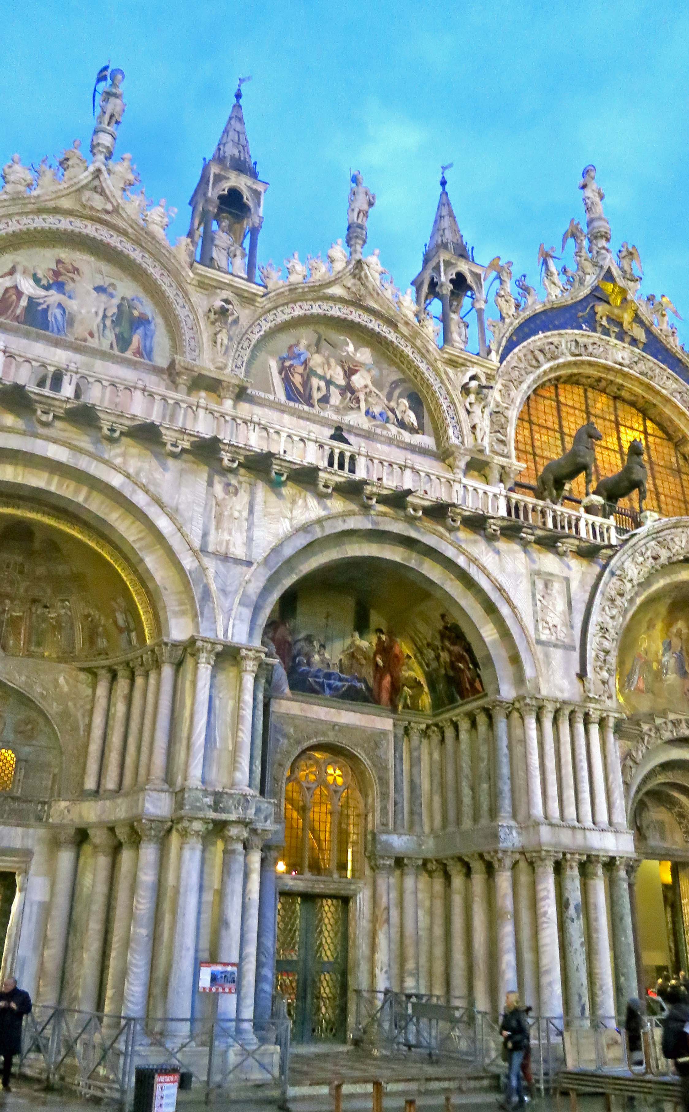 An evening view of the colorful St. Marks Basilica in Venice. The bronze horses on the upper right were stolen from Constantinople during the Fourth Crusade when Venice was supposed to be helping Constantinople, not plundering it. But then, if your church is built on the stolen bones of a Saint, why not? (grin)