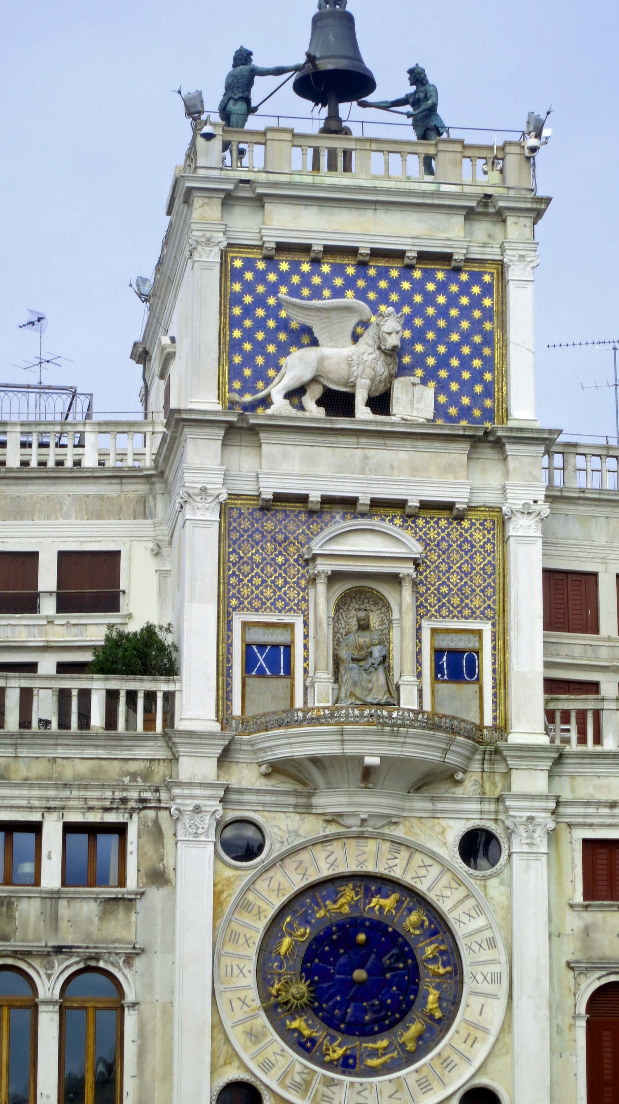This clock tower is another well-known land mark in St. Mark’s Square. Note the winged lion and the digital clock with Roman Numerals. The bronze bell ringers on top and the astrological clock at the bottom are also impressive.