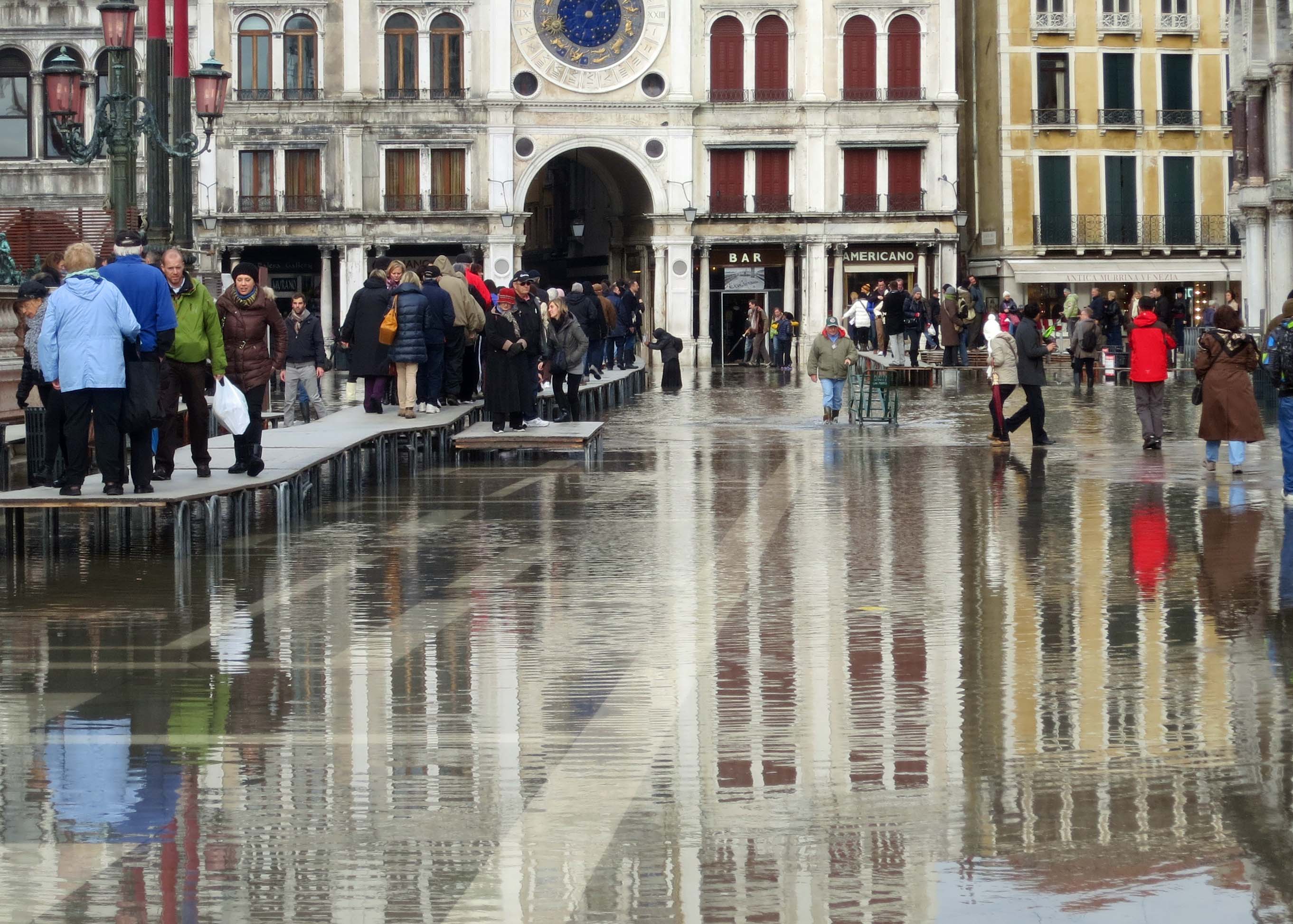As I mentioned, Venice is subject to frequent floods. Global warming has added to this problem. This shot, taken just below the Clock Tower in St. Mark’s Square, shows people using the table walkways and walking through the water.