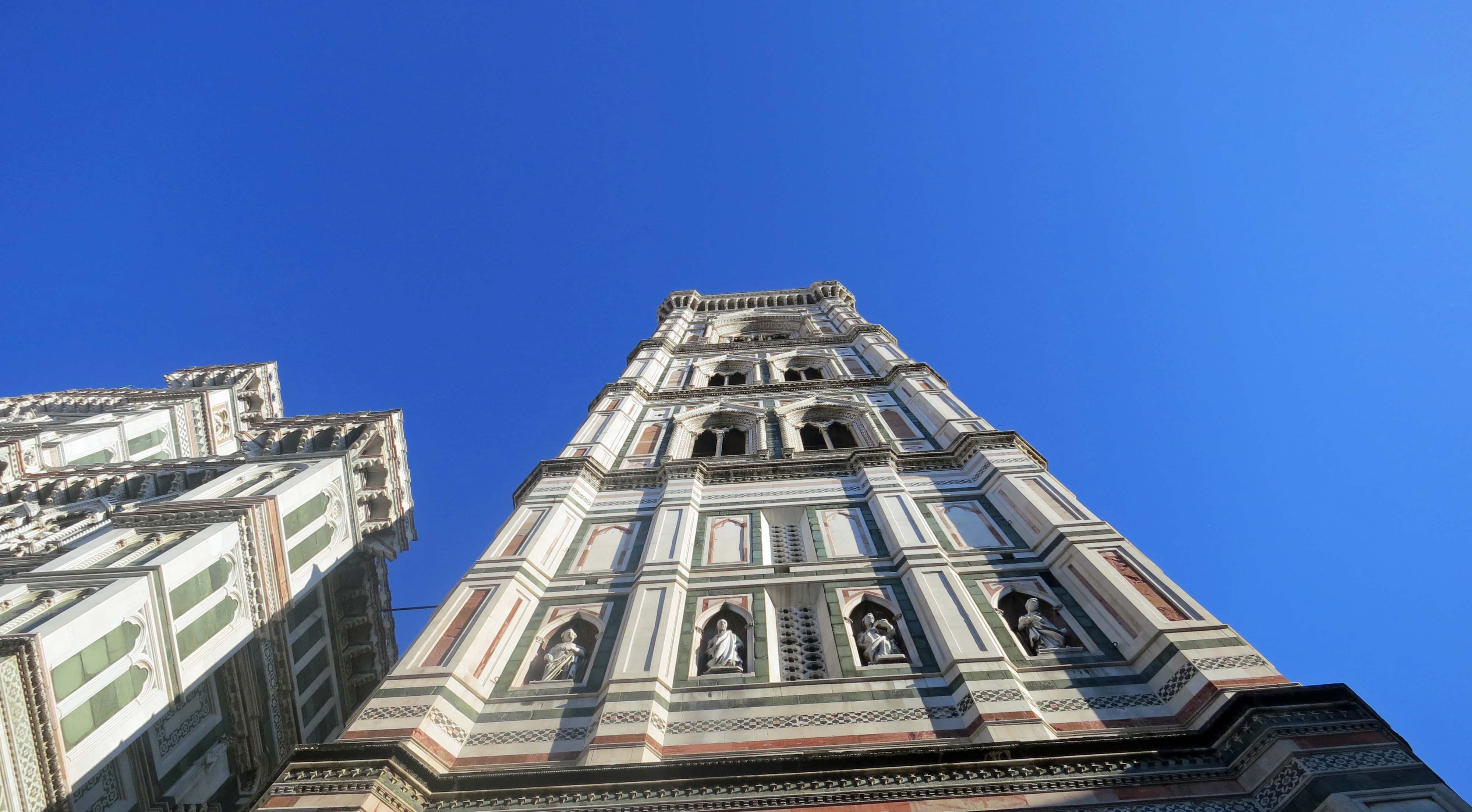 A front view of Giotto’s Bell Tower with the Duomo to the left.