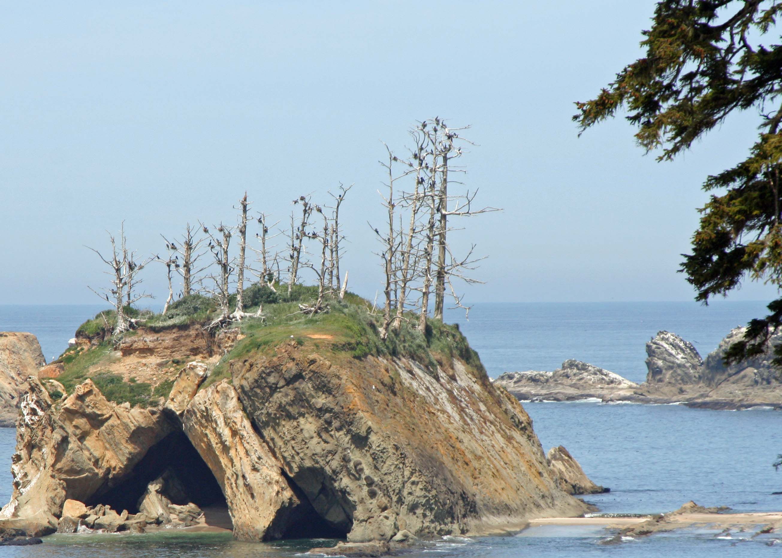 Off shore islands are always great places for nesting sea birds as well as seals, etc. Cormorants had chosen to turn the trees into their homes on this island off Sunset Bay. I loved the striking cave with its teepee like door.