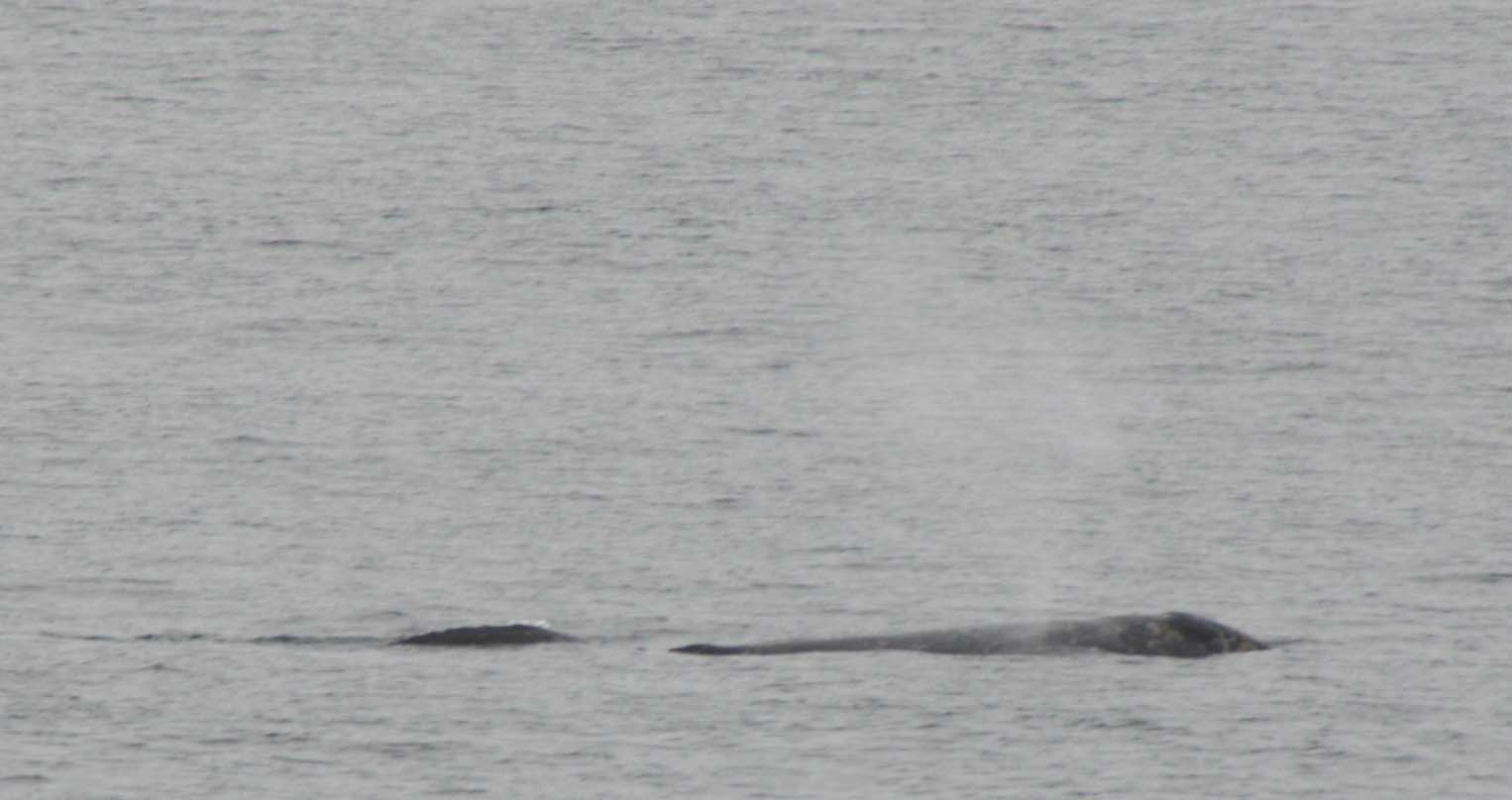For our location and our camera, this is as good as it got. (grin) Still, we were thrilled, as always. The one if front was spouting. (Photo by Peggy Mekemson)