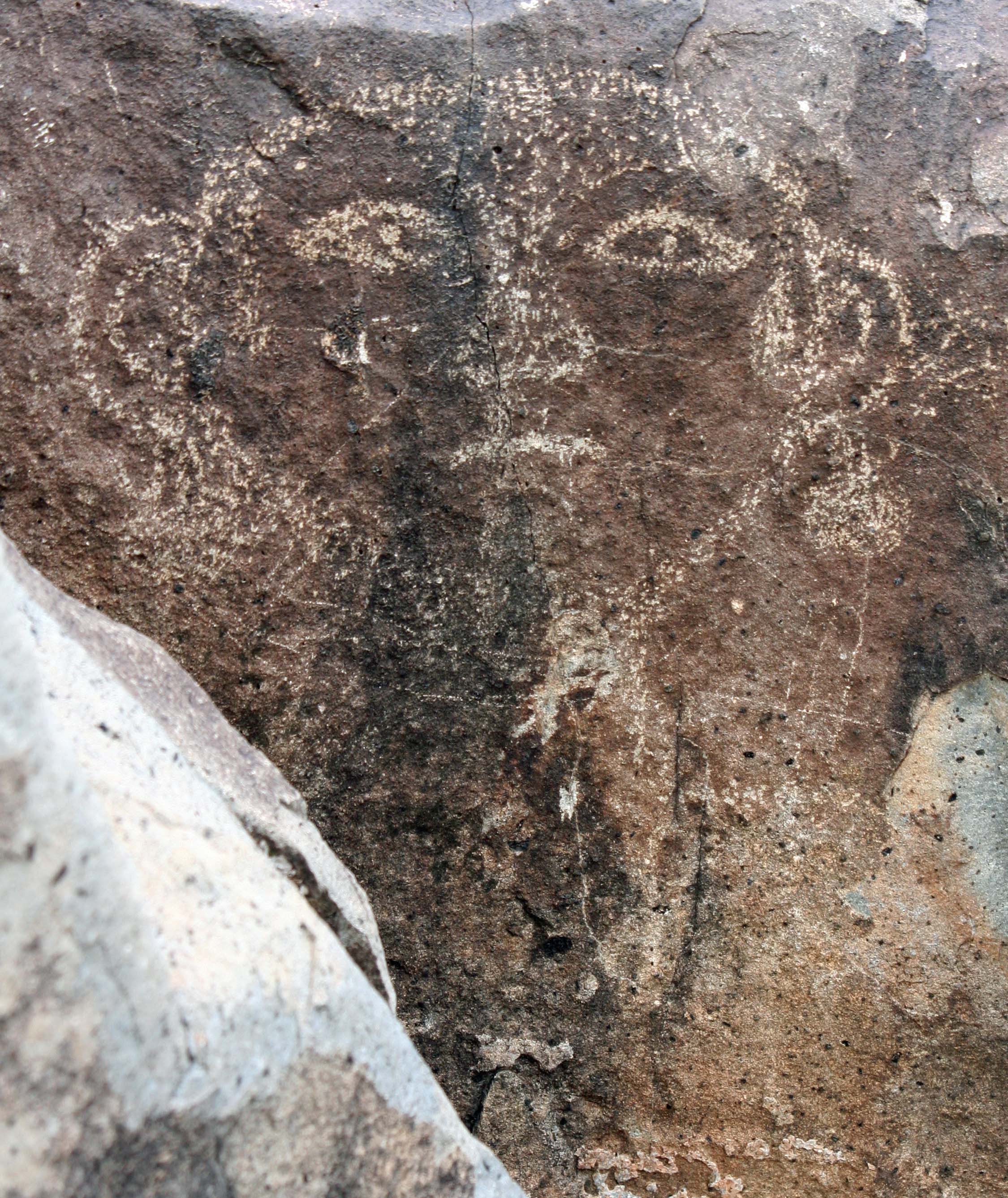 I also found this triangular face fascinating. Many of the petroglyphs at Three Rivers take advantage of the rocks natural features. This one uses the ridge to set off the nose and eyes, and cracks to outline the chin.