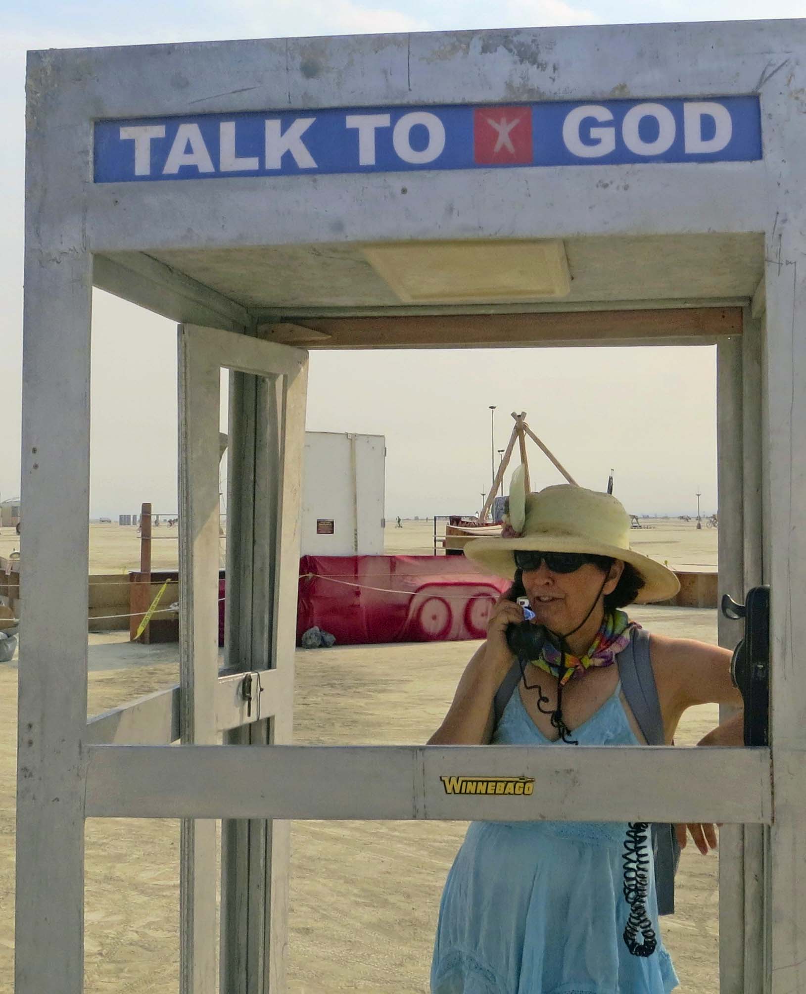 Feeling a little overwhelmed? You can always call on God. One of the theme camps provides a booth. Much to her surprise, Peggy discovered that God is a woman. Peggy told her she was glad she was at Burning Man. I am not sure what Winnebago had to do with the discussion.