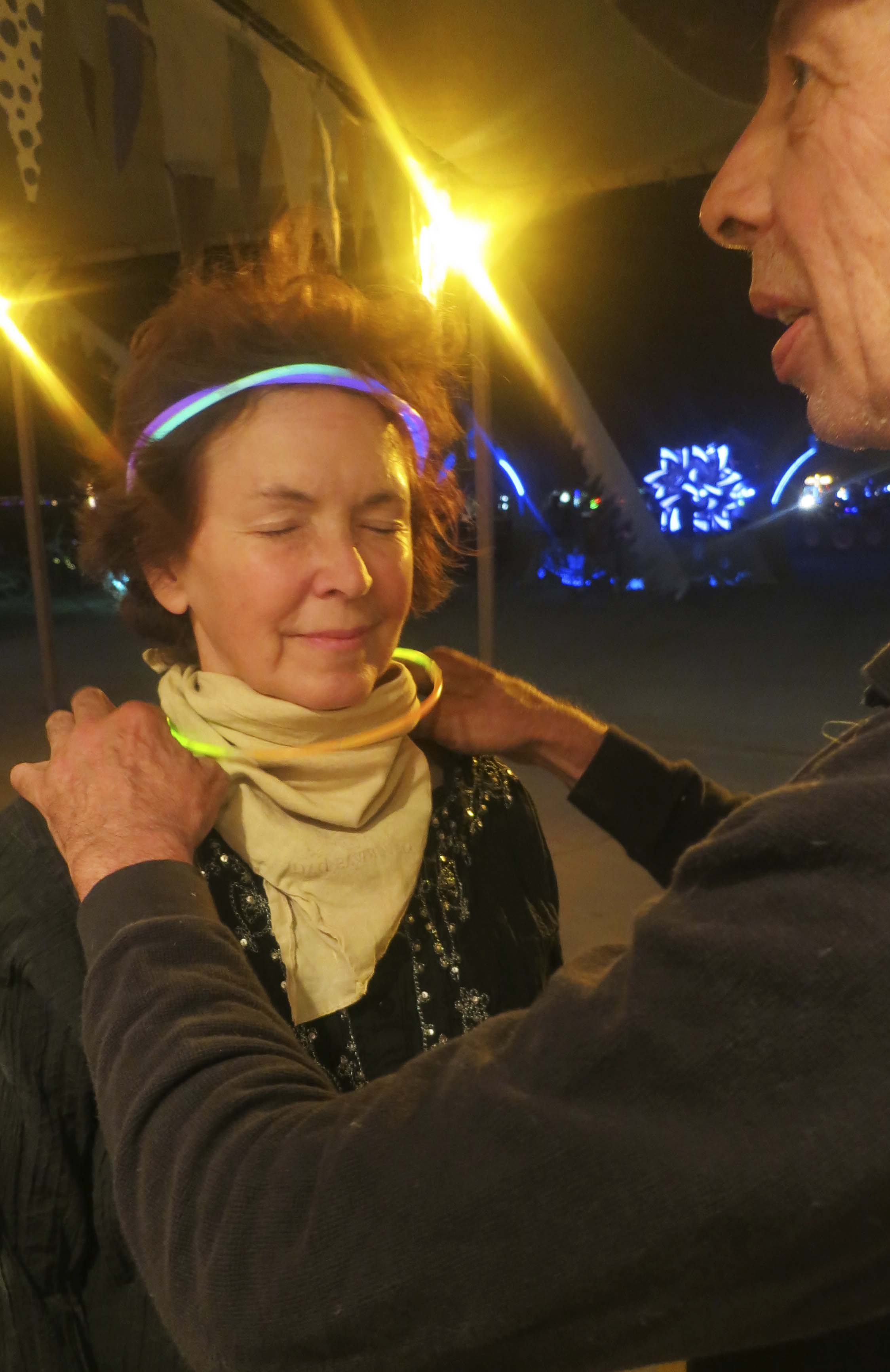 Later we were semi-invited to a wedding where wearing black was requested. Adios didn’t have any black so his wife Punkin outfitted him. You are allowed to have multiple personalities at Burning Man.