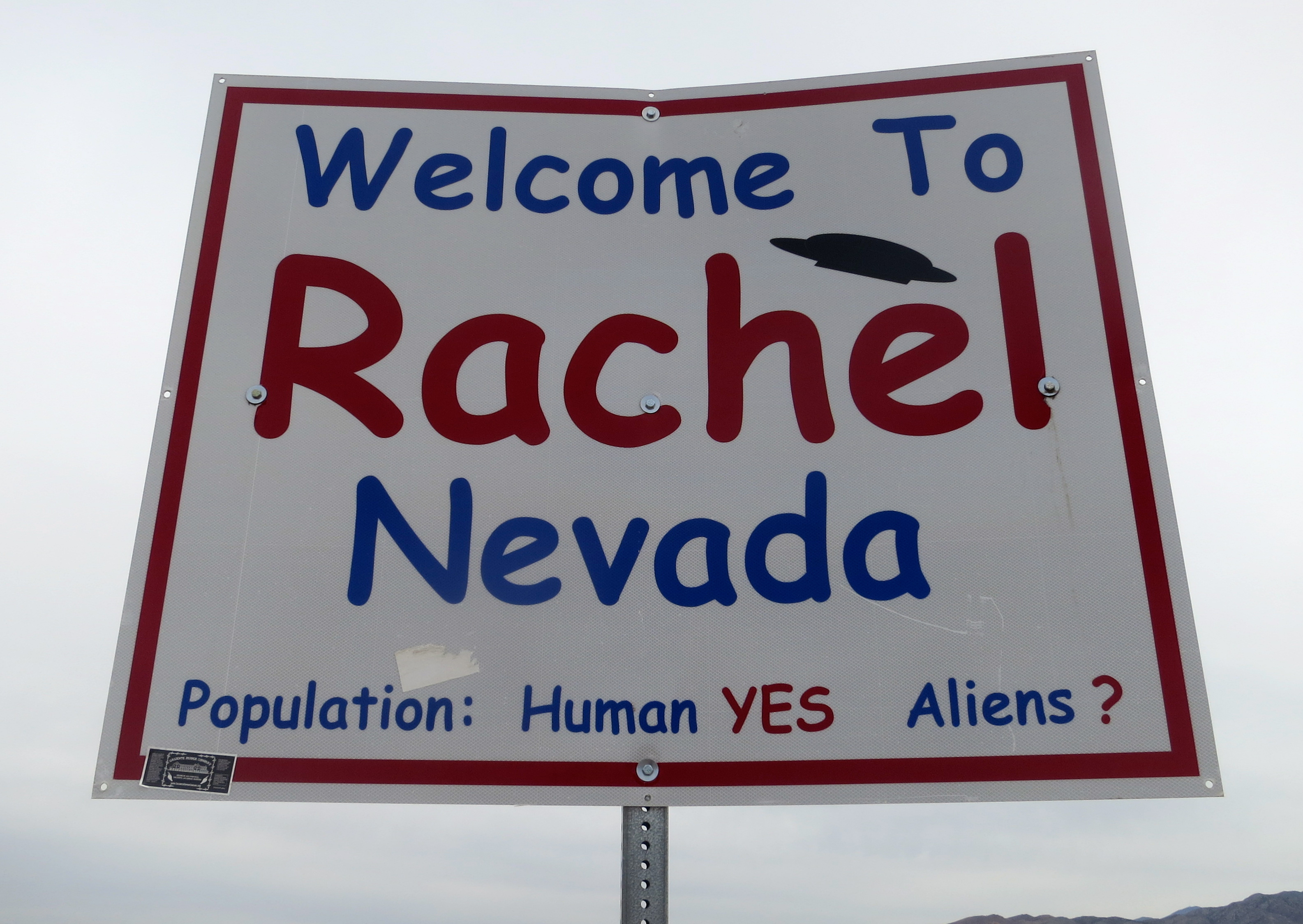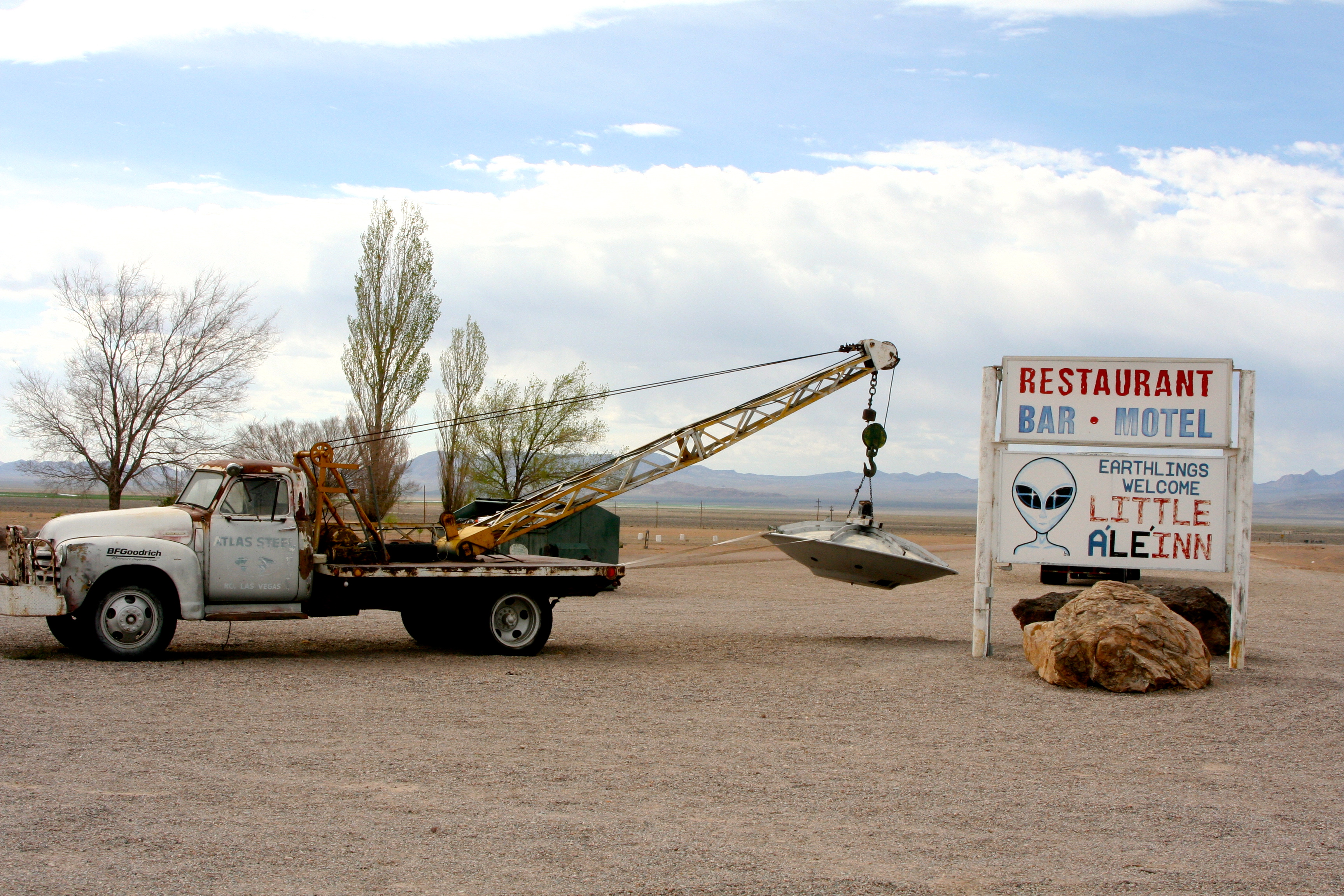 Rachel is located about halfway along the 98-mile road. One sticker-covered sign outside of town proclaimed we were on the Extraterrestrial Highway. Another welcomed us to Rachel and announced that the community is made up of humans and possibly aliens. You can’t miss the A’le’Inn. A tow truck carrying a flying saucer is parked out front.