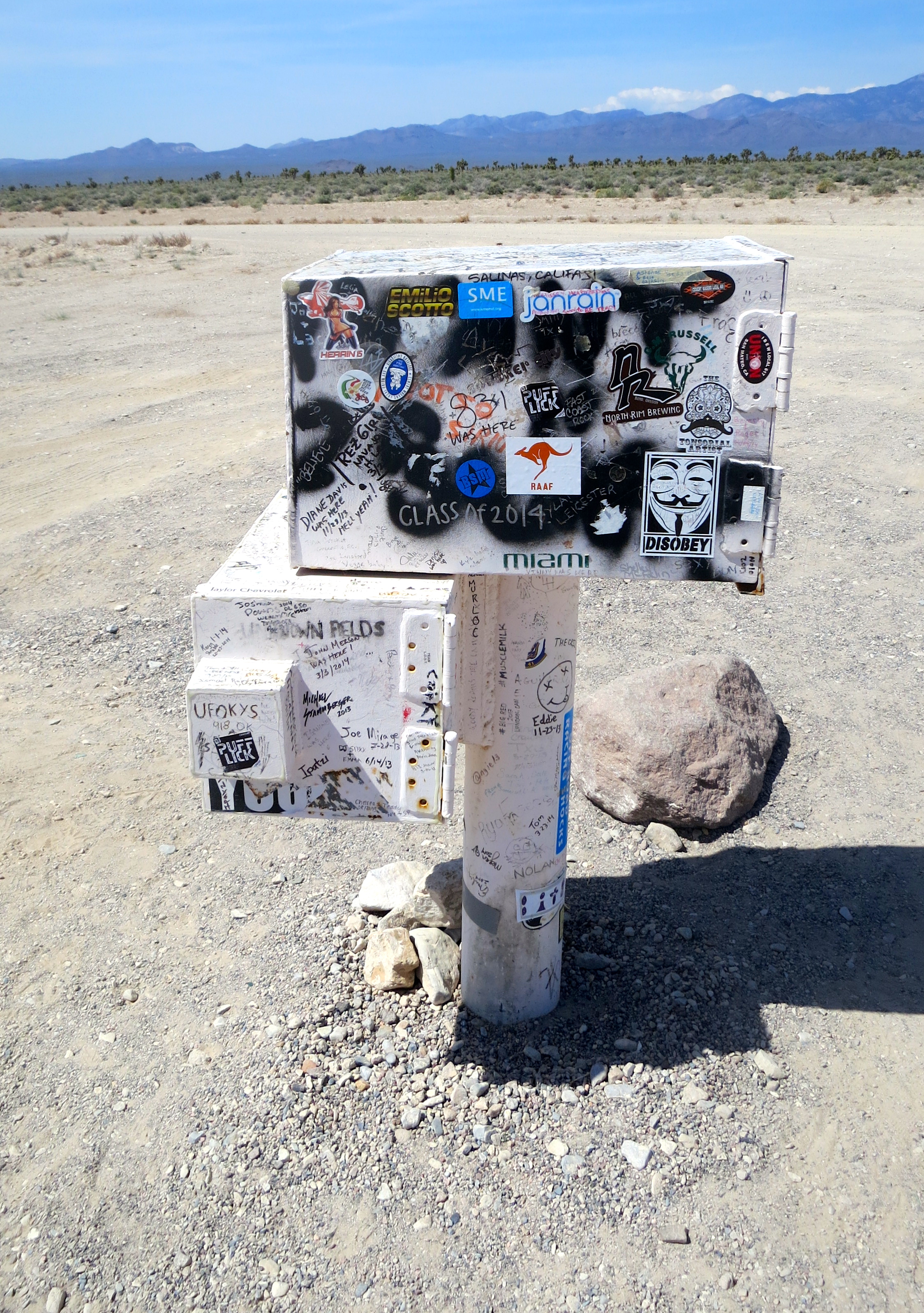 The Black Mailbox is the only sign you will find marking the front entrance to Area 51. Flying saucer fans claim it is one of the best places in America to see UFOs. They gather around it at night and scan the skies. Actually, the mailbox belongs to a local rancher and is now painted white; or it is if you can see through the graffiti and stickers.