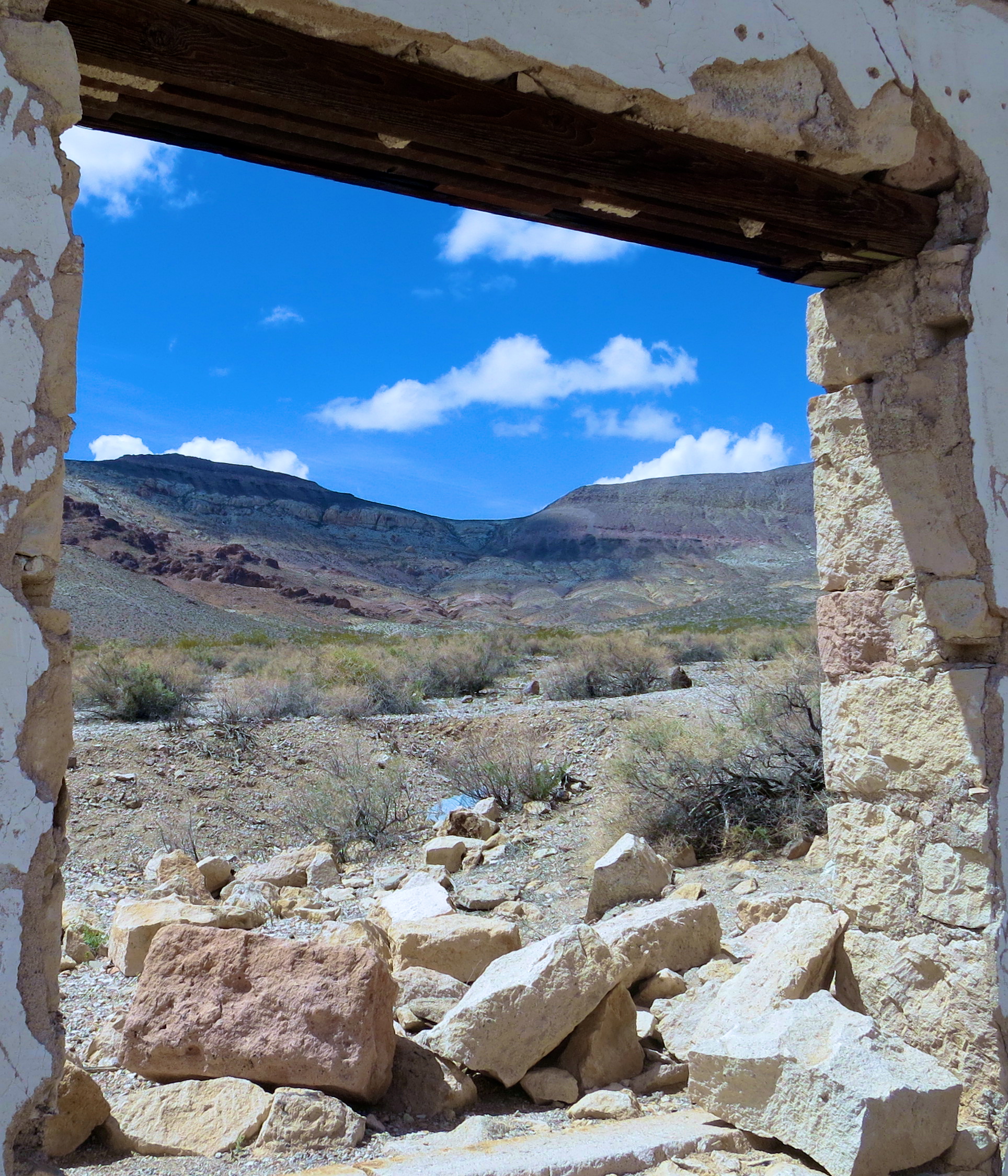 They say it is better to be on the inside looking out than the outside looking in. I don’t think it matters in Rhyolite. But I did like the composition that pulls you out toward the mountains.