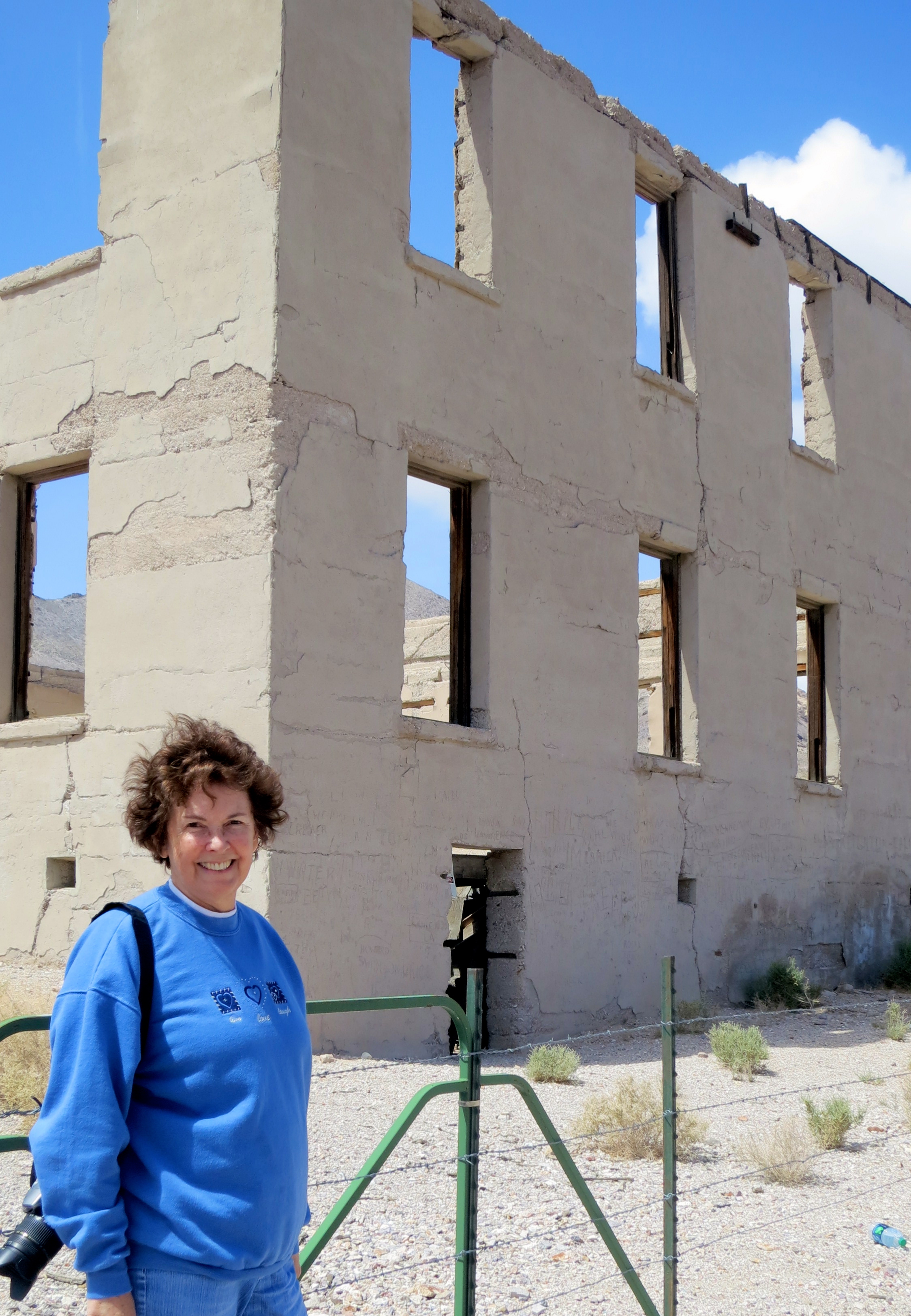 I asked Peggy, a retired elementary school principal, to pose for me in front of Rhyolite’s school. Her hair, which totally has a mind of its own, had been teased by the desert wind.