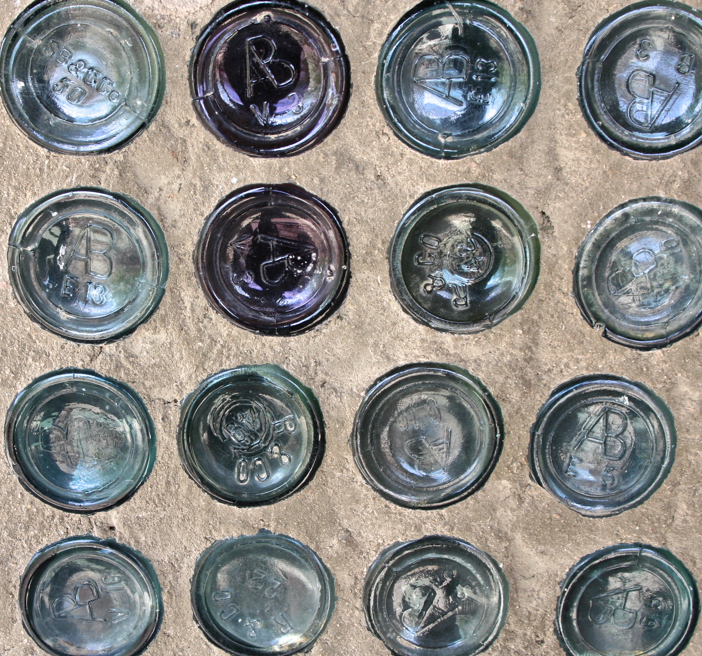 A close up of the bottles. The marks on the bottom indicate the company that made the bottles. AB stands for American Bottling Company, for example. (Photo by Peggy Mekemson.)
