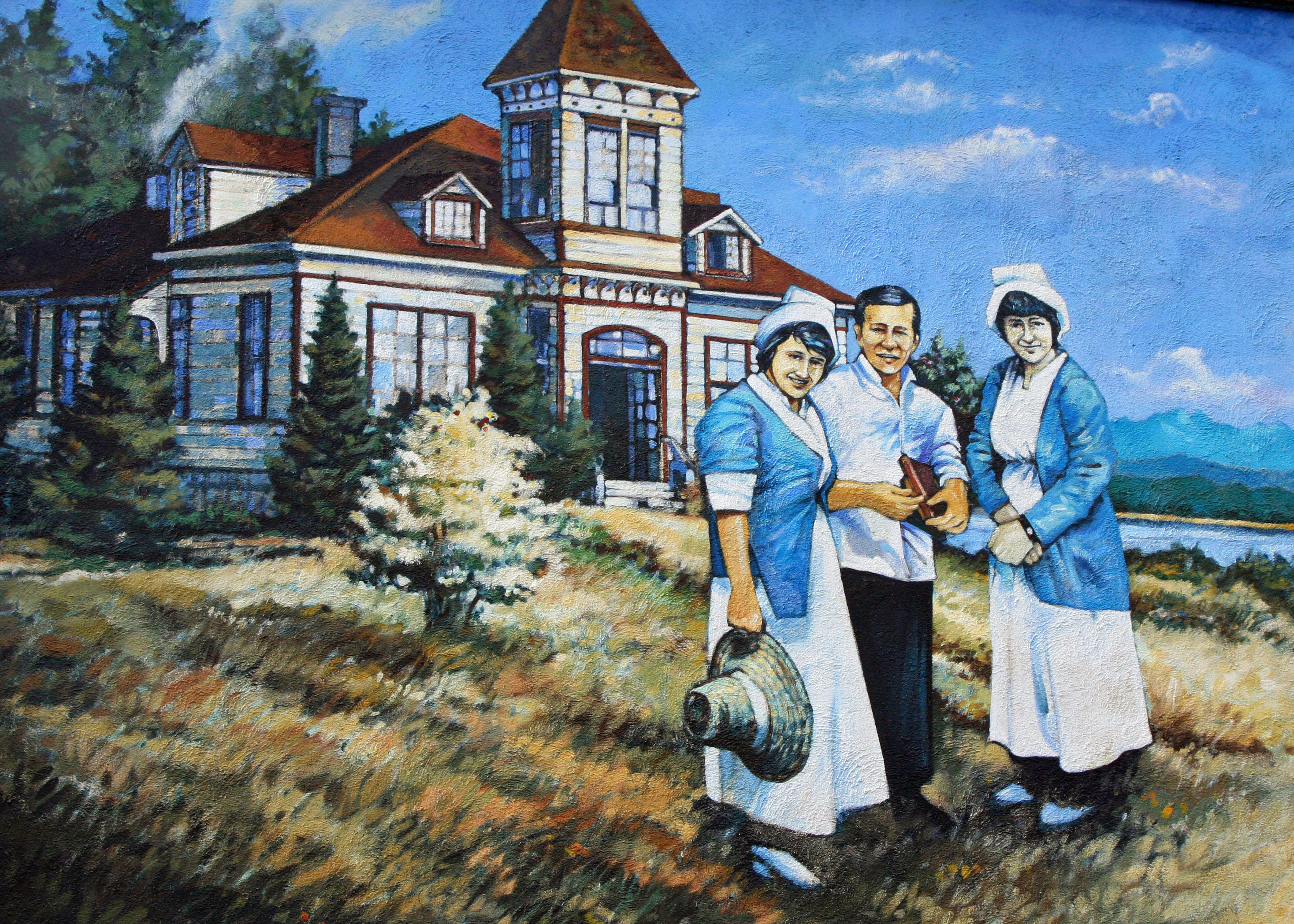 This mural captures the Chemainus Hospital in 1904 along with two nurses and the hospital cook.