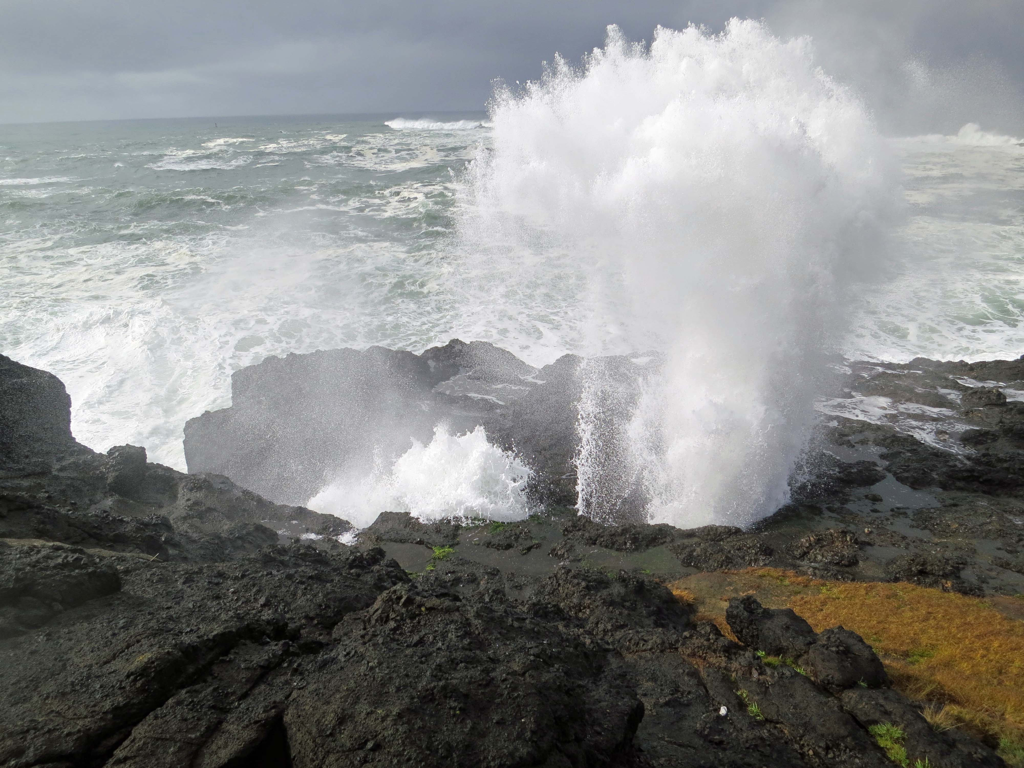 View of waves thrown into the air at Spouting Horns, Depoe Bay, Oregon. Photo by Curtis Mekemson.