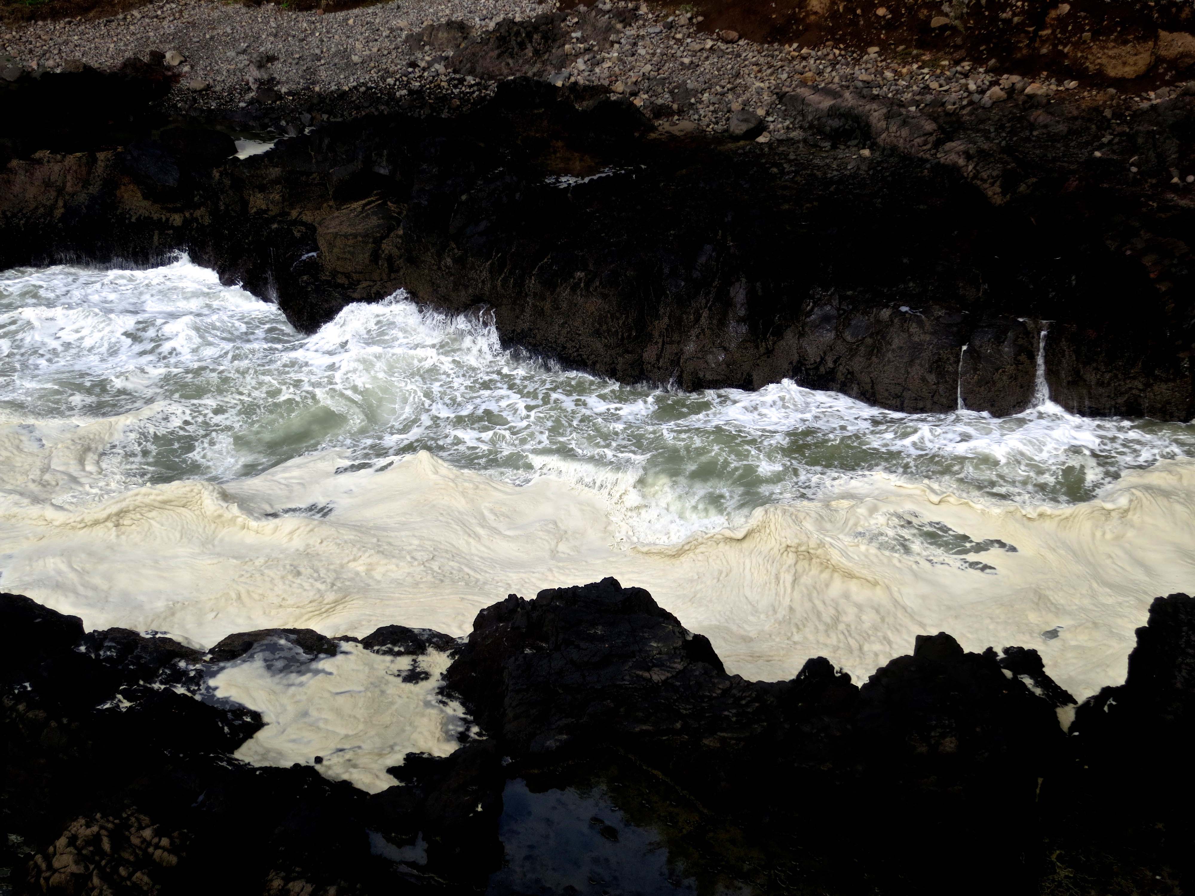 It’s known as the Devil’s Churn. Waves come driving in from the ocean and are forced up a narrow channel, turning the water into a frothy, whipped cream like texture.