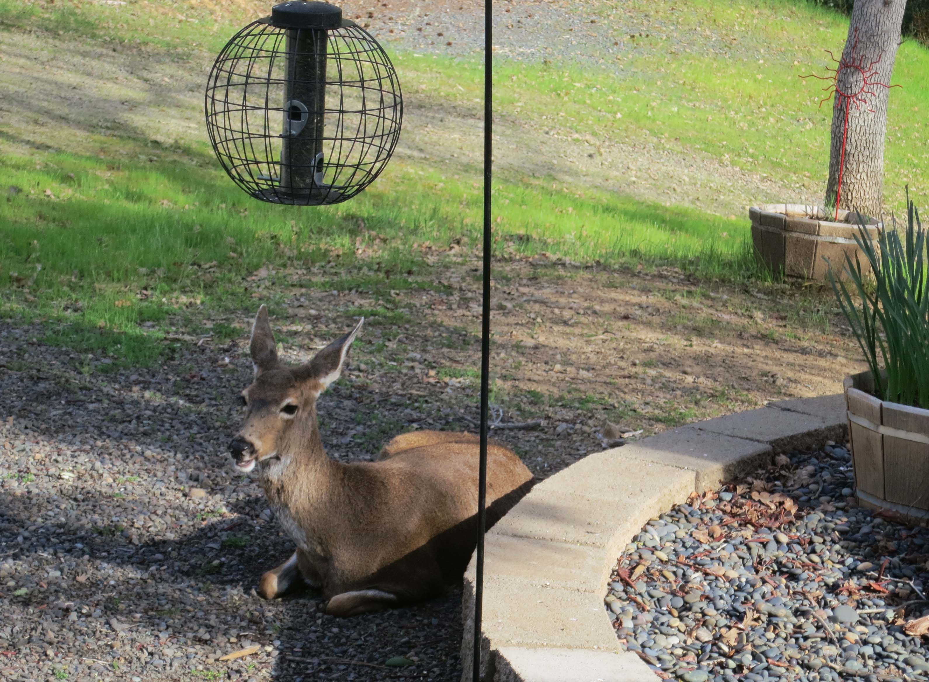 Another chooses to lie down under our Madrone, just to the left of the first doe.