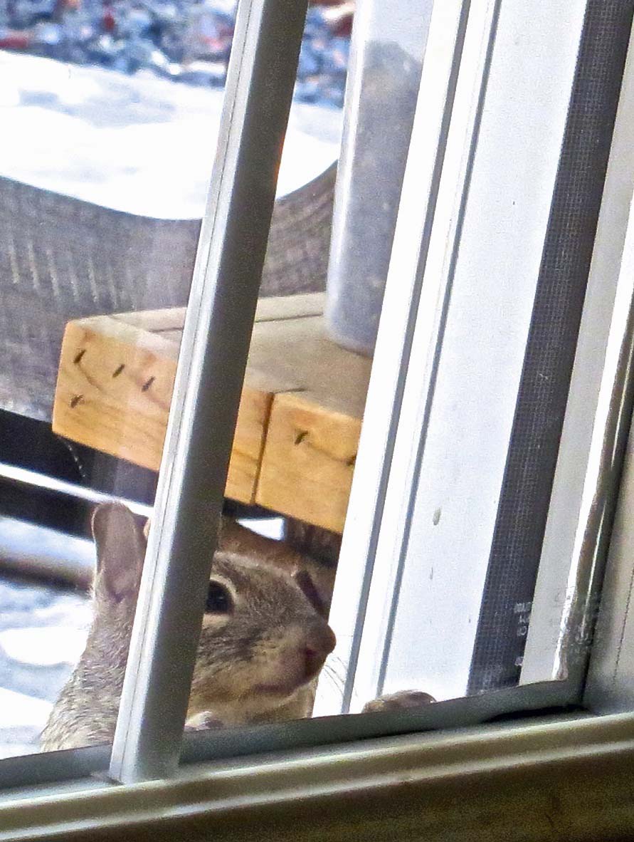 A ground squirrel peers through a glass pane on our door. “Come on Curt, lend a hand.”
