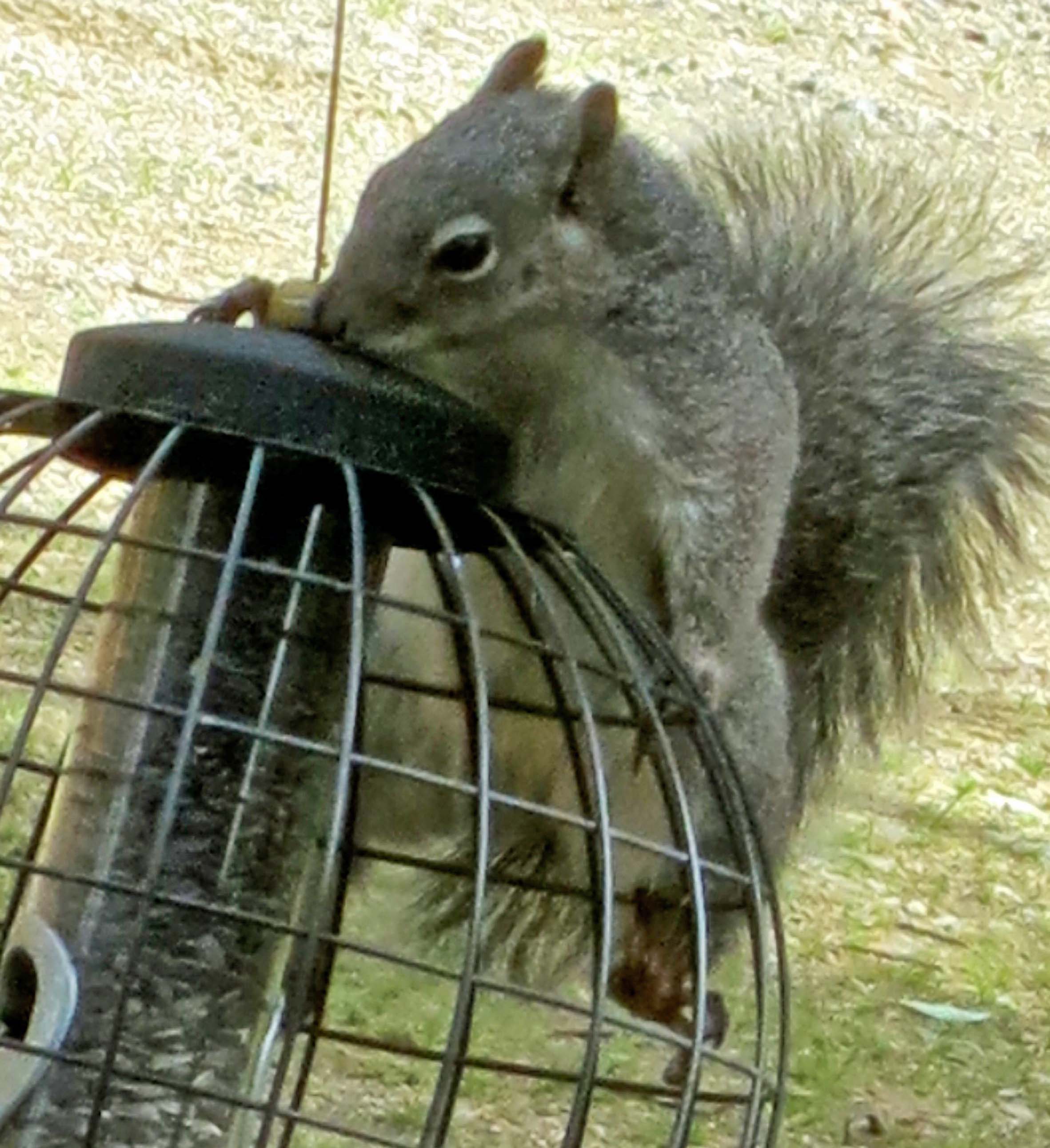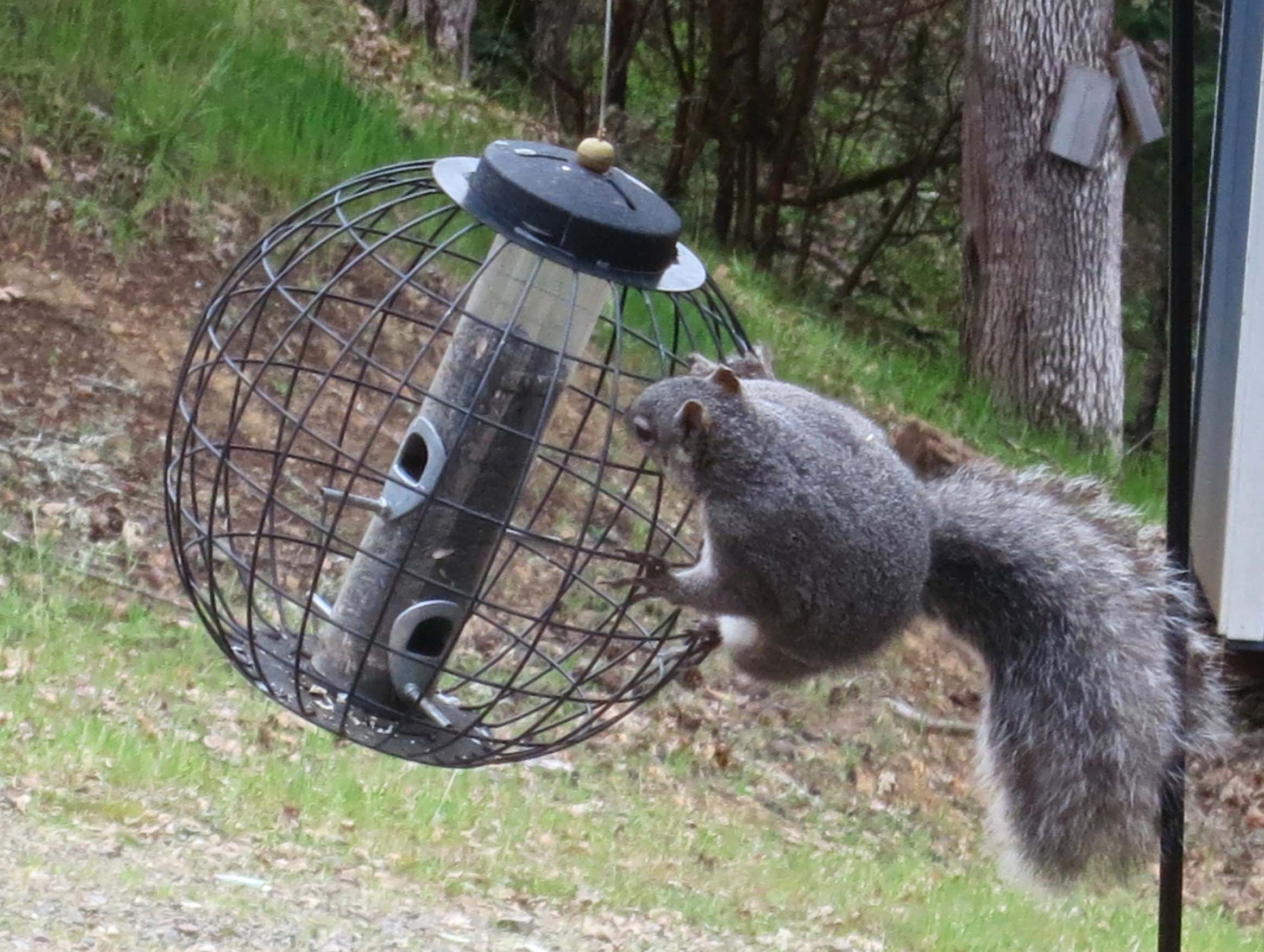 Grey squirrel Applegate Valley of southern Oregon, tackles a bird feeder. Photo by Curtis Mekemson.