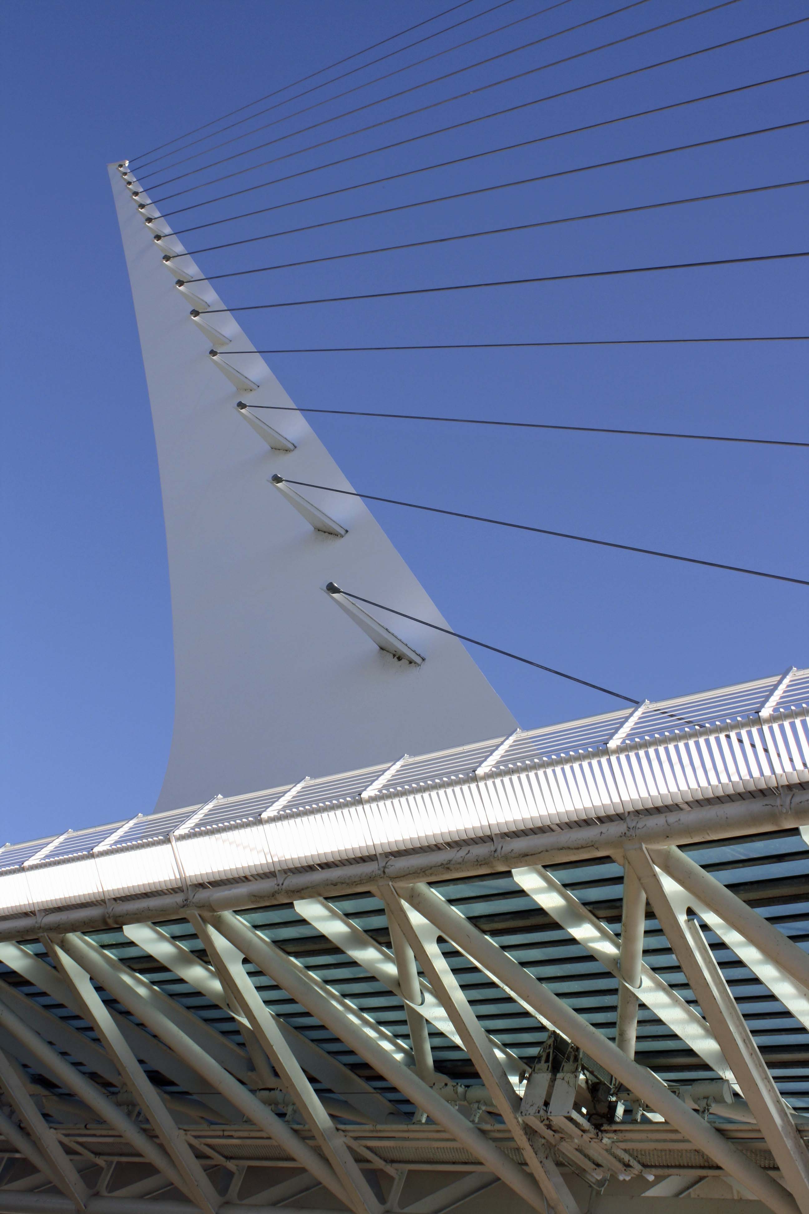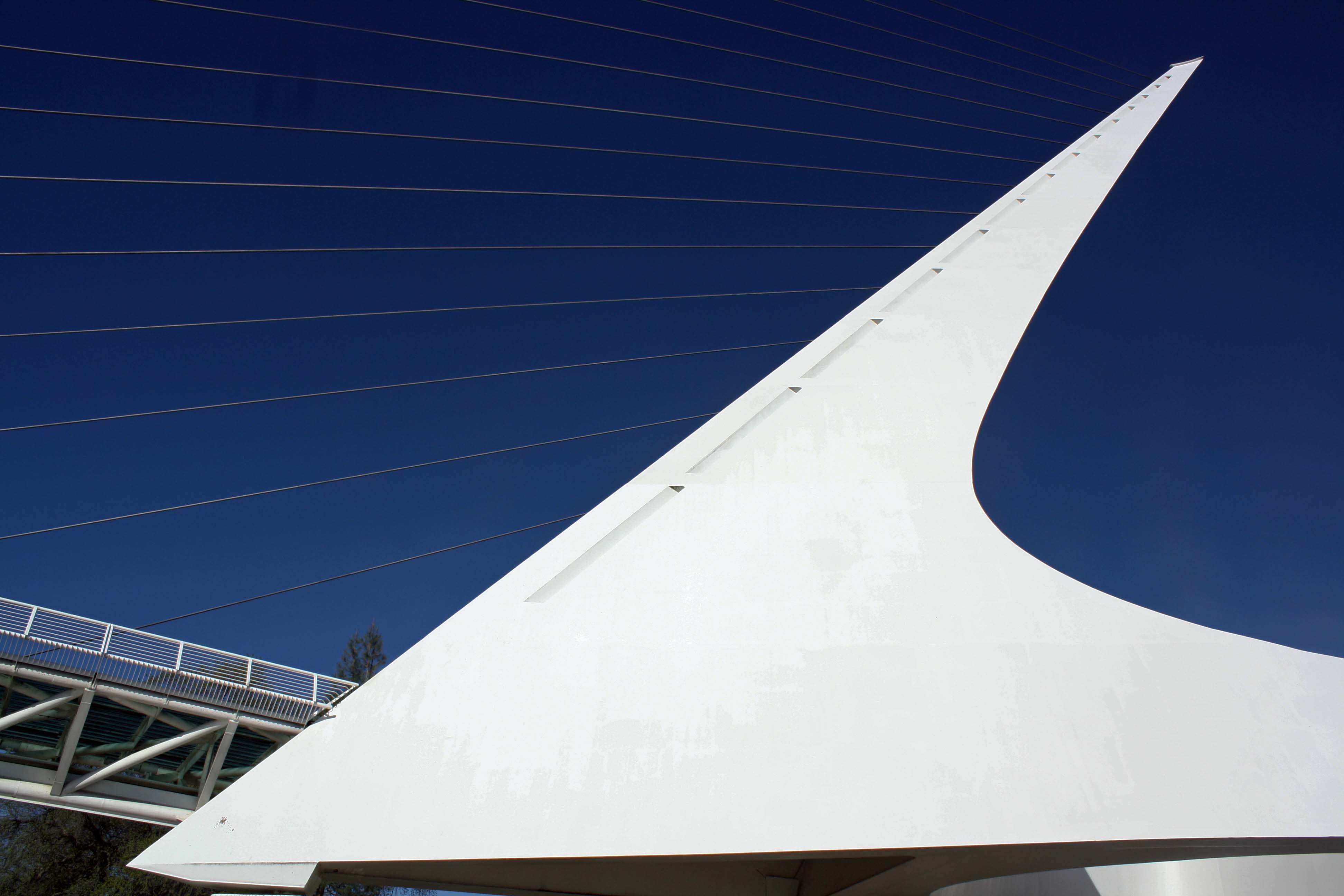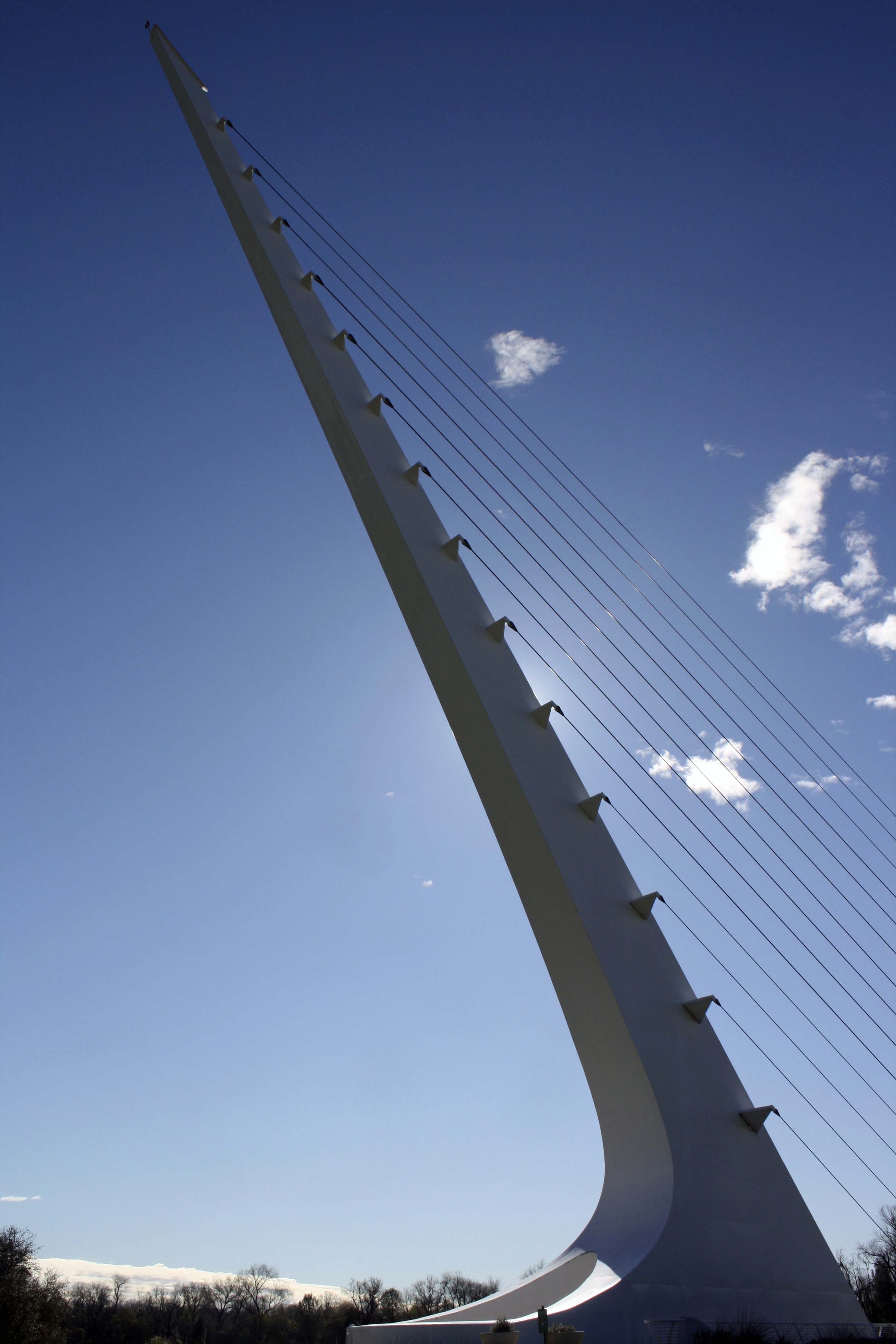 The bridge, completed in 2004, spans the Sacramento River with a 700-foot deck that is made up of 200 tons of granite and glass. Graceful cables connect the deck with the bridge’s 217-foot tall sundial/pylon and provide suspension. The renowned Spanish architect, Santiago Calatrava, designed the bridge. Known for his work on bridges in Europe and numerous other structures around the world, the project was his first freestanding bridge in the United States.