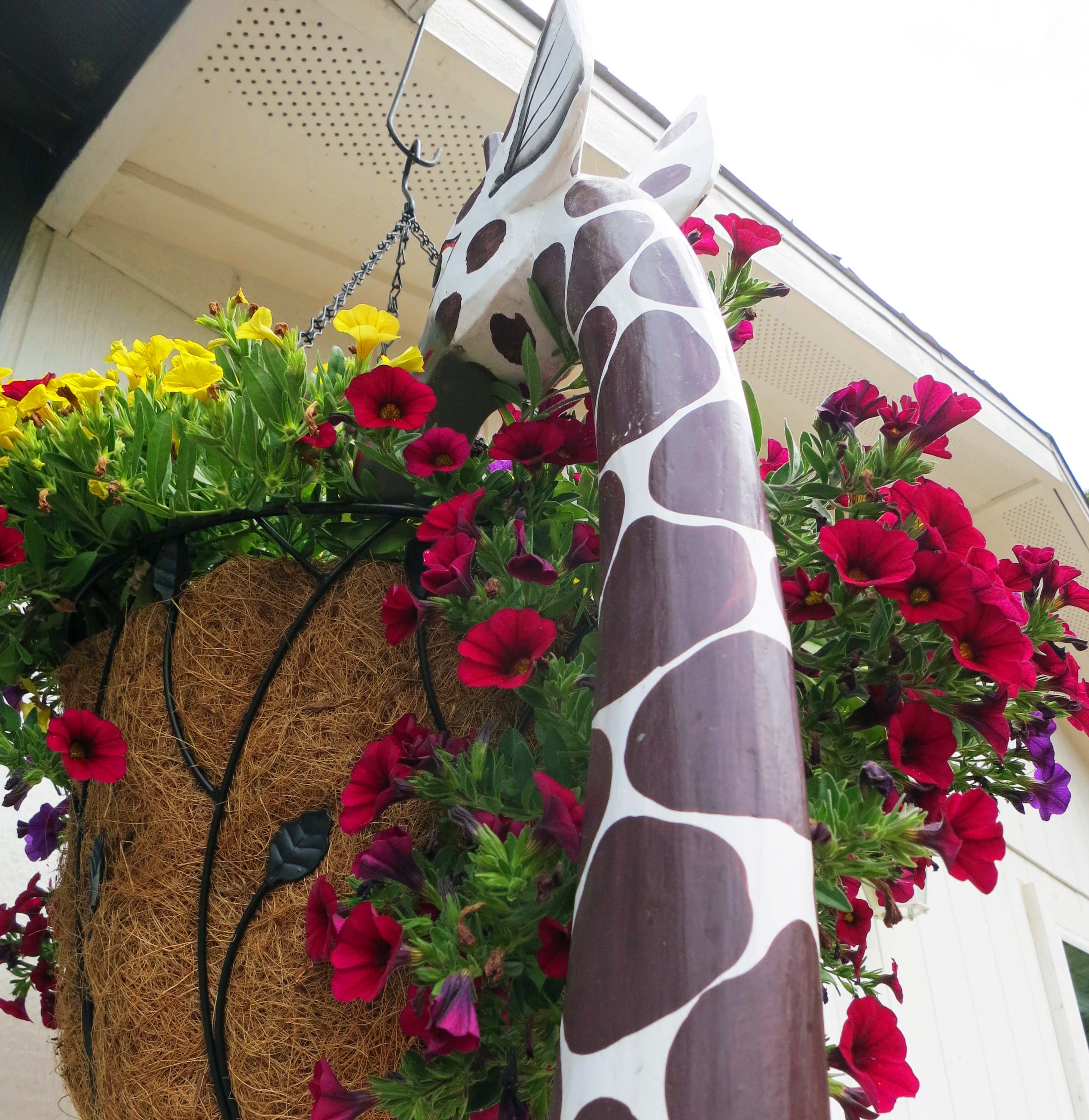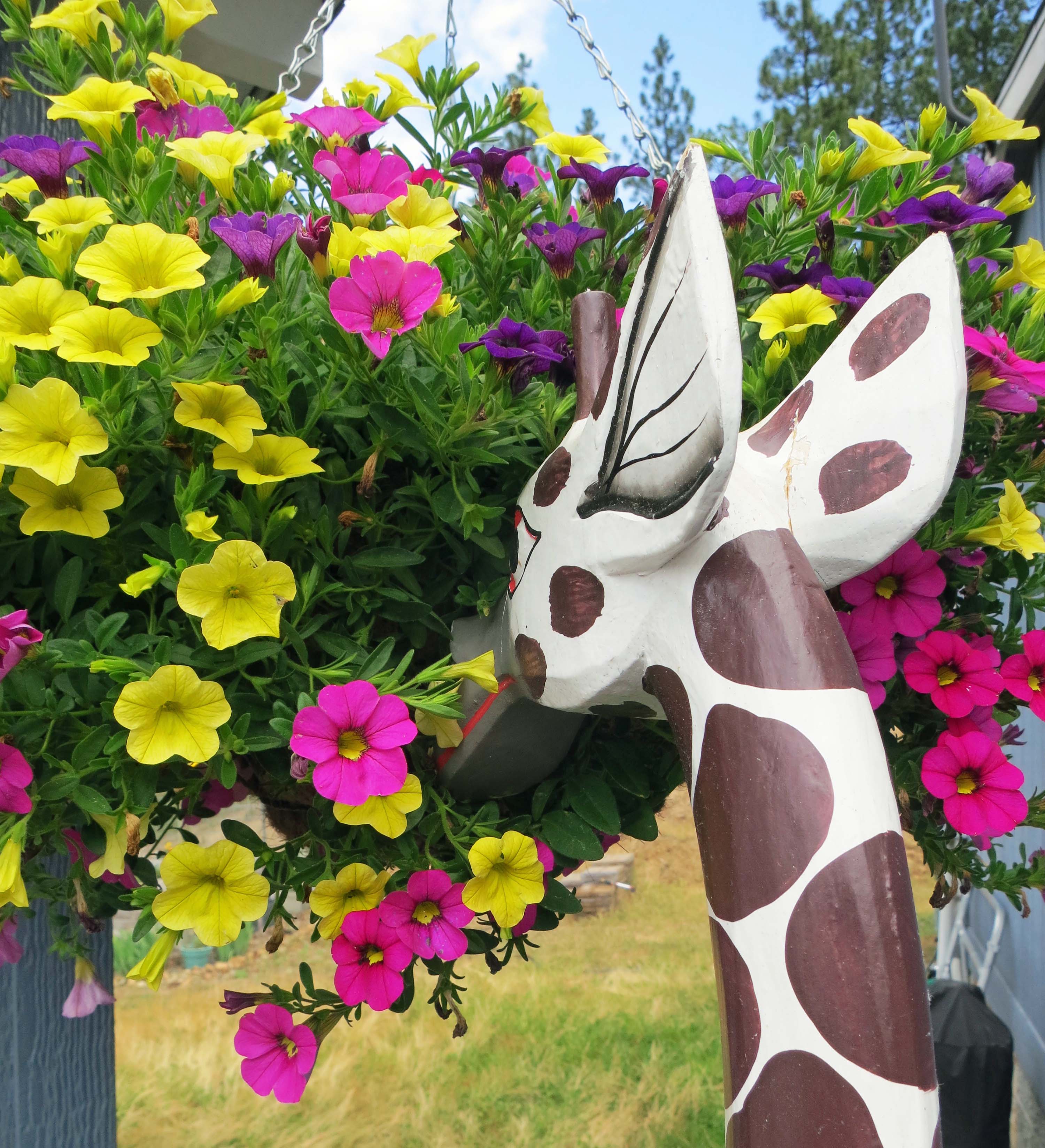 Peggy fell in love with this balsa wood giraffe we found in Jackson, California. So the giraffe came home with us. Little did we think it would have a taste for petunias.