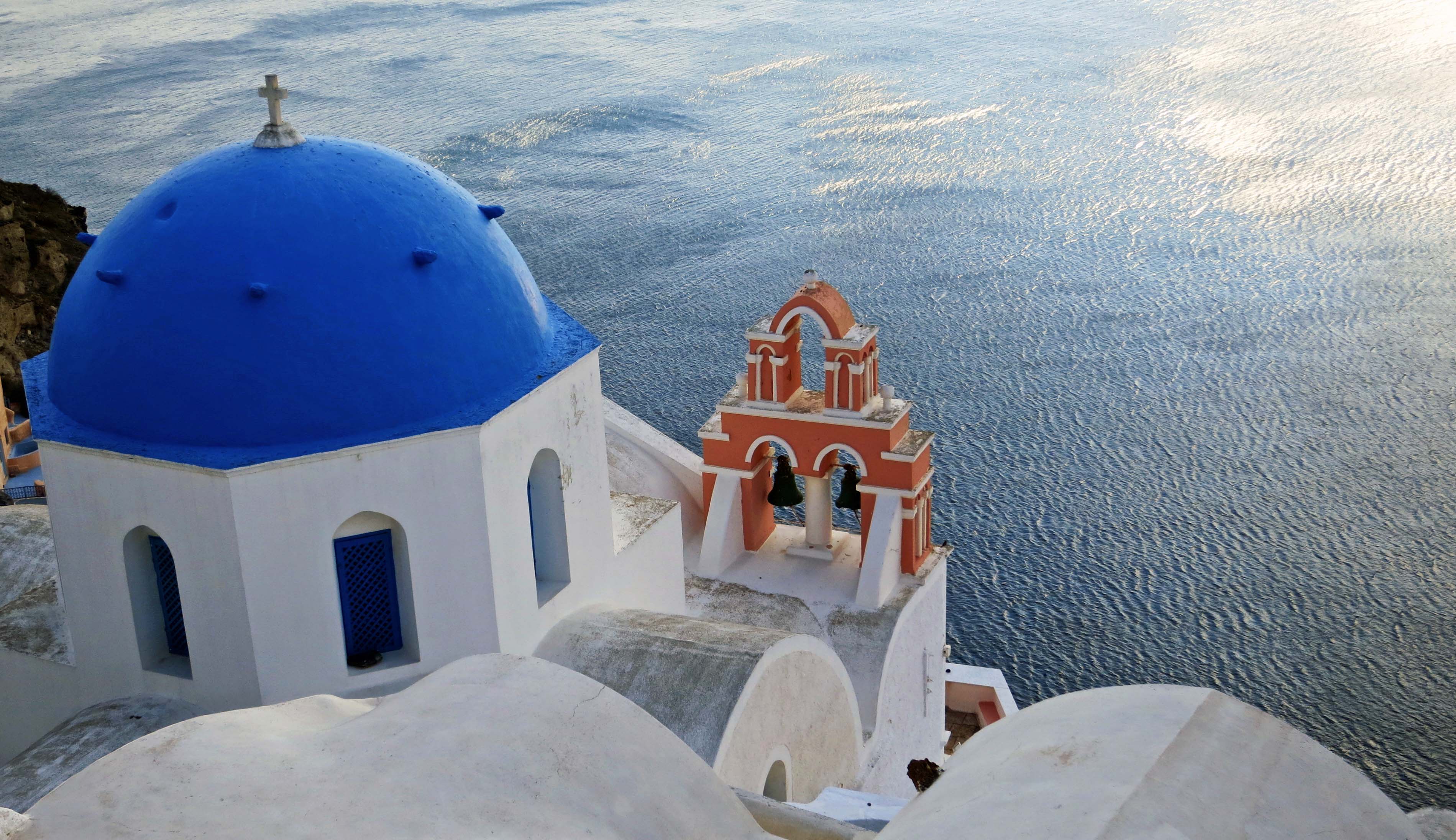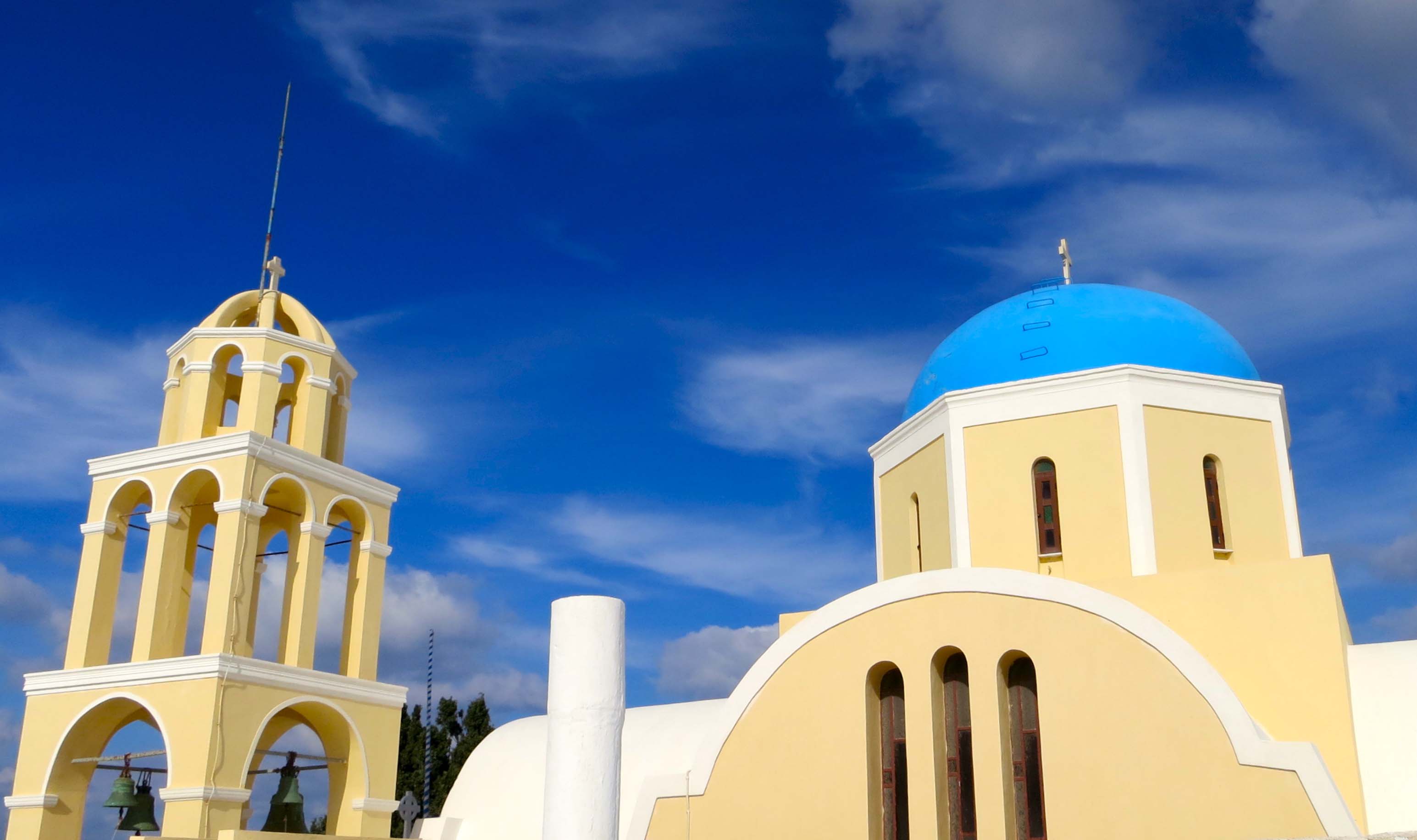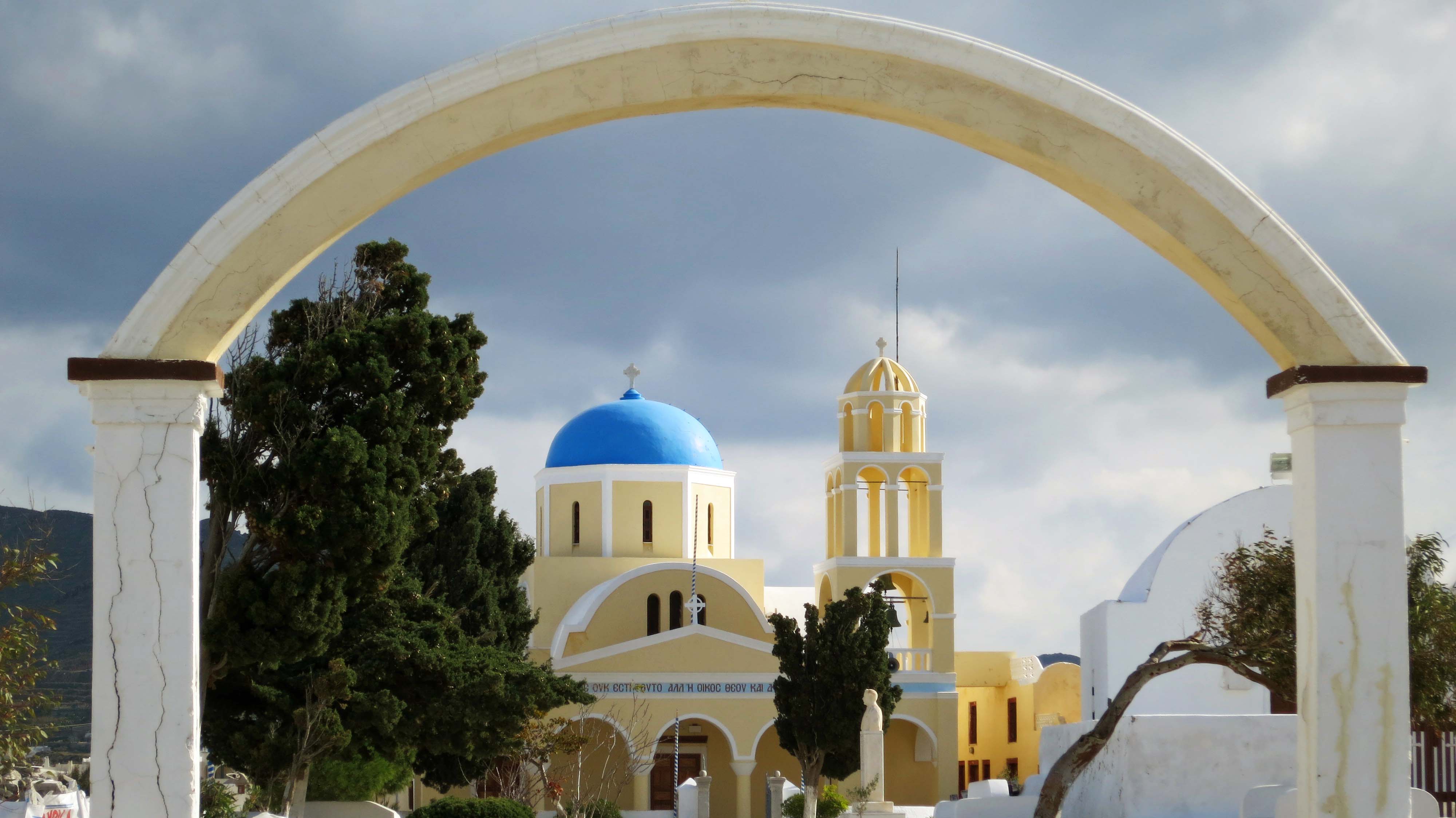 The Anastasis Church in Oia provides a striking view of the Aegean Sea.