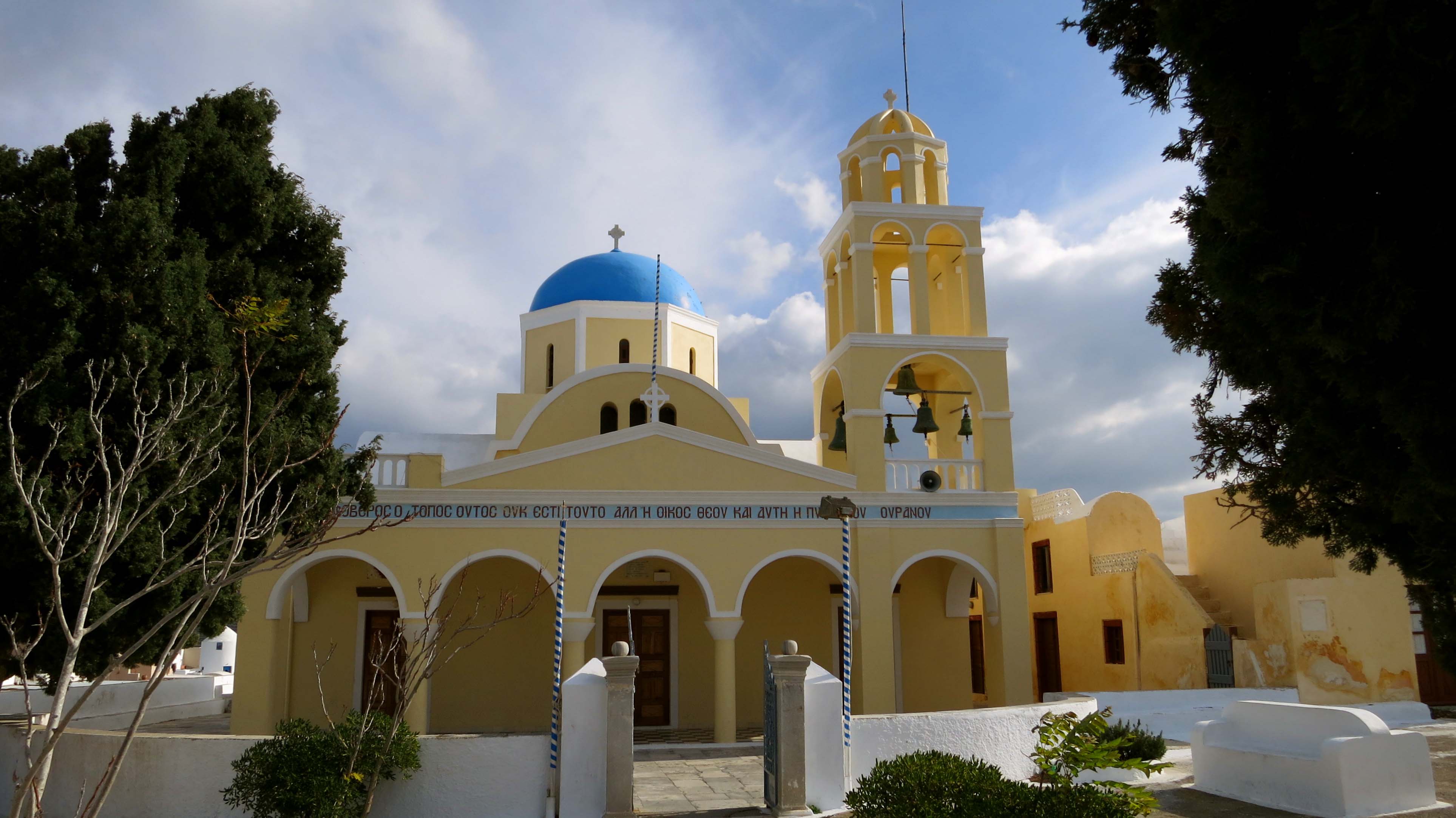 The Church of Panagia Platsani is the first church we encountered in Oia. (Photo by Peggy Mekemson.)
