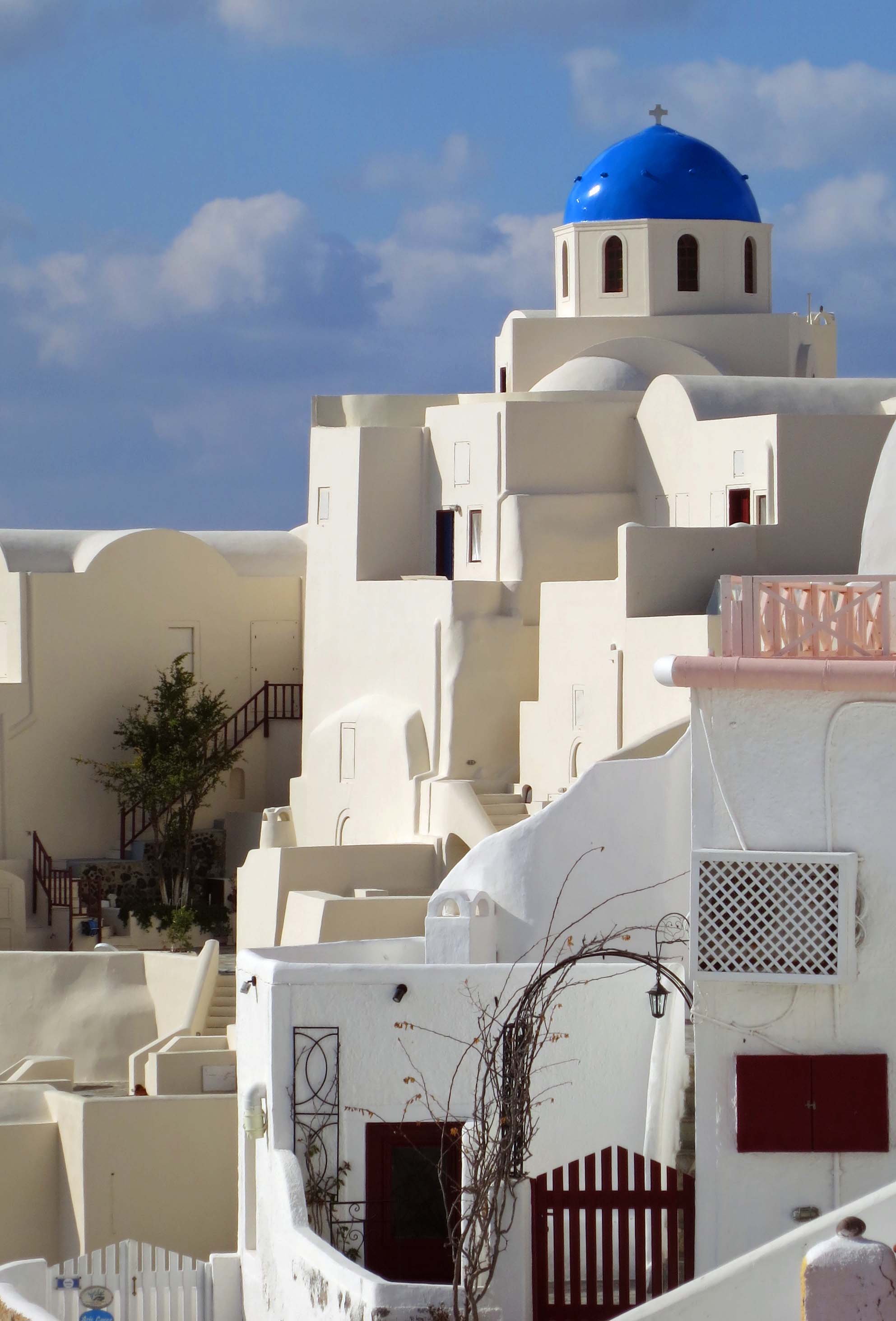 It is a combination of the blue domes, unique architecture, magnificent setting and Mediterranean light that make the many churches in Oia so outstanding. (Photo by Peggy Mekemson.)