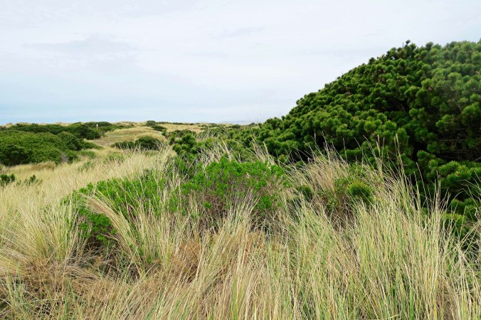And I took this picture looking over sea grass. Parts of Bandon can be seen across the river. We were on our way to walk out the North Jetty.