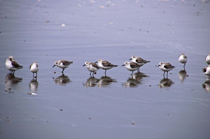 Walking along the beach we found a flock of Sanderlings. These small shorebirds are a delight to watch as they charge in unison along the beach following the tide as it rises and falls in search of delectable bugs. I liked the reflection provided by the receding water. (Photo by Peggy Mekemson.)