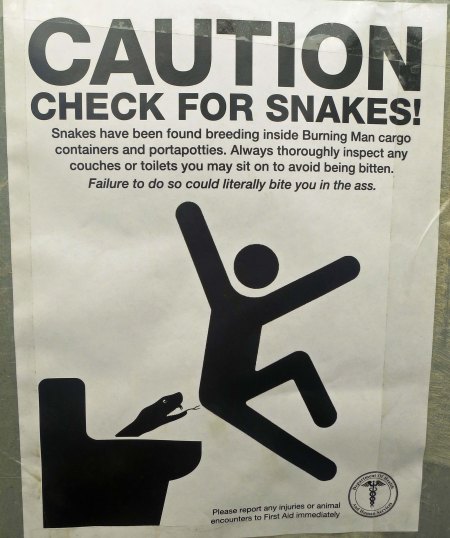 Hi Andrea, and welcome to the world of Burning Man. I can pretty much promise you an experience unlike anything you have ever had. I’m sure you will master porta-potty 101 just fine. They can get a little full after a long night, especially toward the end of the week when all 70,000 people are present, but generally, Burning Man does a good job of keeping them clean. No snakes (grin). As for survival… a good set of goggles and something to cover your nose and mouth in dust storms. I use a bandana. Some use medical or even painters masks. You will even see gas masks, which may be a bit of overkill. Water: Be sure to drink lots and often. Carry a water bottle. Dehydration is a major problem. Bring at least a gallon of water per day for yourself. Sunblock. A bad sunburn can really detract from the event! A well lit-up bike. (You can walk but distances are considerable.) Bring an inexpensive or old bike with large tires. Skinny tires sink in the dust! Even larger tires can at times. You want to be seen at night when thousands of people are riding through Black Rock City and out on the Playa. So make sure your bike is well lit. Likewise you want light for yourself. There are lots of lighting options out there now, but glow sticks can do the job. Peggy and I use around 20-25 per night each.