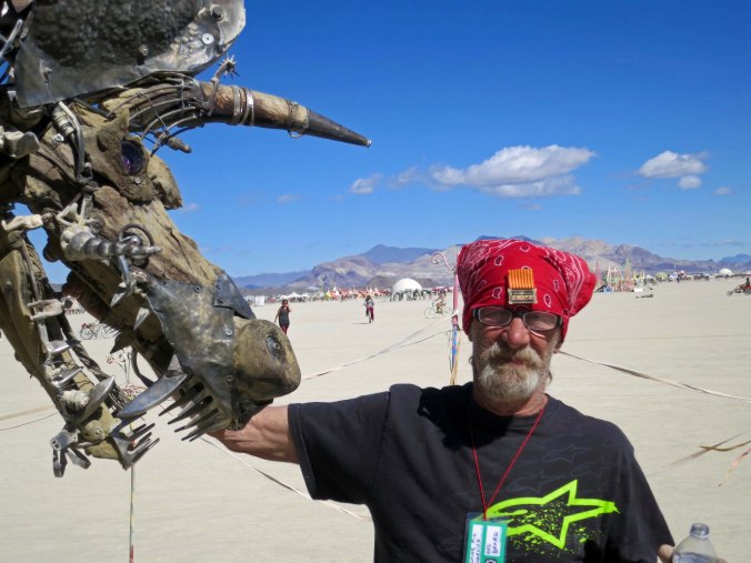 Enjoying and appreciating art is a major reason why people go to Burning Man. Creating art is another reason. This man was standing next to a dragon sculpture he had made out of recycled and repurposed materials.