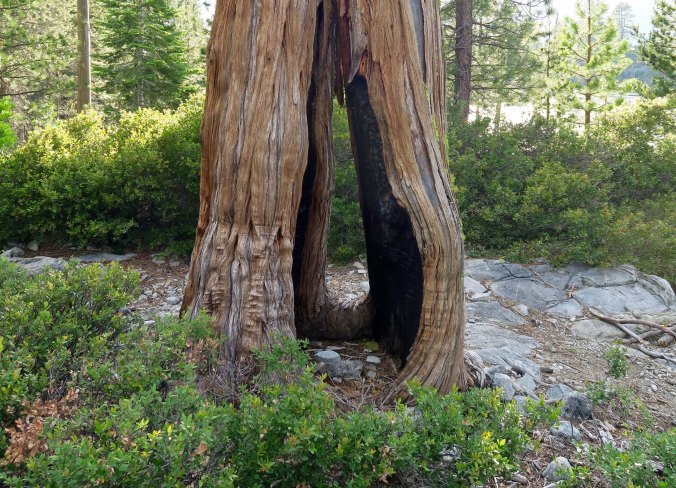 In my walk-about after dinner, I discovered that the Incense Cedar I featured at the top of the post was actually two trees. Fire, possibly set by lightning, had burned out the space between the twins.
