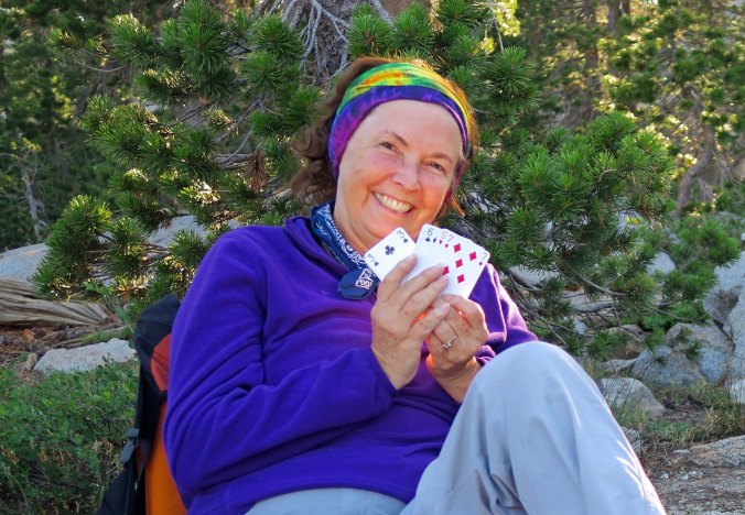 It wasn’t all backpacking. Here Peggy displays her cards in a game with the 9-year-old Cody. This would have been a bad hand for poker. It was even worse for War, which Cody insisted she play with him whenever we camped, including at 6:30 in the morning!