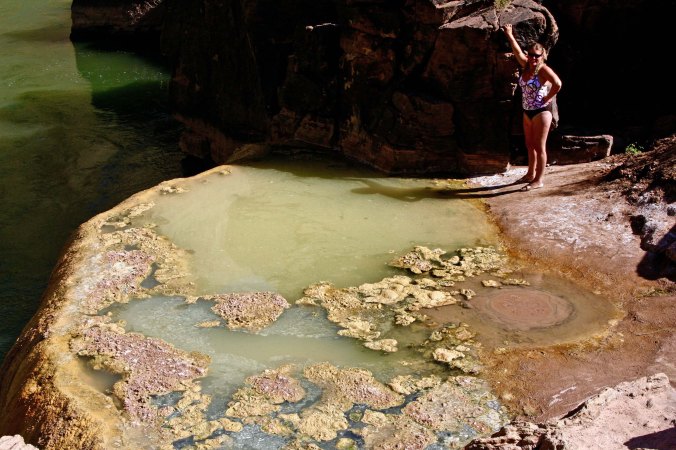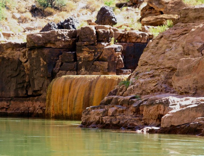 As we passed outside of the National Park boundary on our trip down the Colorado, the Canyon lost some of its grandeur. But there was still plenty to see. Pumpkin Springs was a good example. It looked like a huge pumpkin. Beth, whose nickname is Pumpkin, was glad to climb up on top of the springs for perspective. The gourd-like structure is another example of a travertine formation created by the lime pumped out by the hot springs. An interesting note is that the spring also has a high concentration of arsenic. Health standards are set at 50 milligrams per liter. The level at Pumpkin Springs has been measured at over 1000! Don’t drink the water! Bone, of course, had to take a sip, but doing anything  he does usually has an inherent risk. I once watched him dive into a pitcher of margaritas at Senior Frogs in Mazatland, Mexico and refuse to come out until a señorita gave him a kiss.