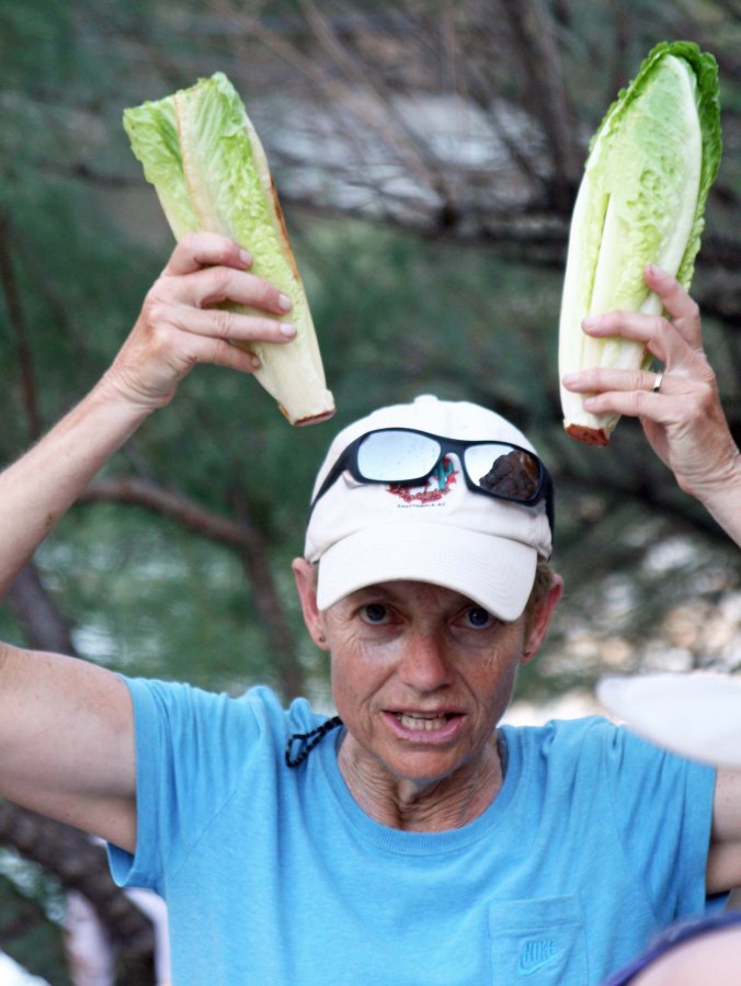 I wasn’t too surprised when Susan Gishi sported Romaine Lettuce as rabbit ears. In fact, wandering around with my camera, I may have encouraged her. Nor was I surprised when she wielded the cutting knife threateningly. Or when the kitchen crew started head loading the salad containers (not too successfully). Tom ran a tight ship in the kitchen and his mutinous crew responded with humor. After 15 days on the river, his efforts at organization were somewhat analogous to herding cats, or maybe kangaroos. It tended to make him grumpy.
