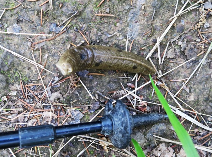 This large slug checked out Peggy while I took its photo. The walking pole is Peggy’s. Mine stayed affixed to the back of my pack after the accident for the whole trip.