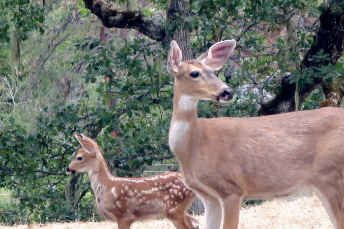 Laughing, a bit. Peggy and I normally see more deer in our yard during a day that I do out on the trail in a month. Lovely pests is a good summary. And few things are cuter than a two week old fawn charging around our yard and running circles around his mom. Fortunately, the deer leave our bias feeders alone! –Curt