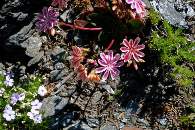 I was interested to see the olivine. There have been a lot of articles about it recently, because of the volcanic eruptions in Hawaii; people are noticing its gorgeous green color there, and I learned that it’s the source of the gemstone peridot. The flowers are gorgeous, as well. I don’t have a clue what most of them are, but that doesn’t make any difference — I’m just glad they’re along the route to offer encouragement!