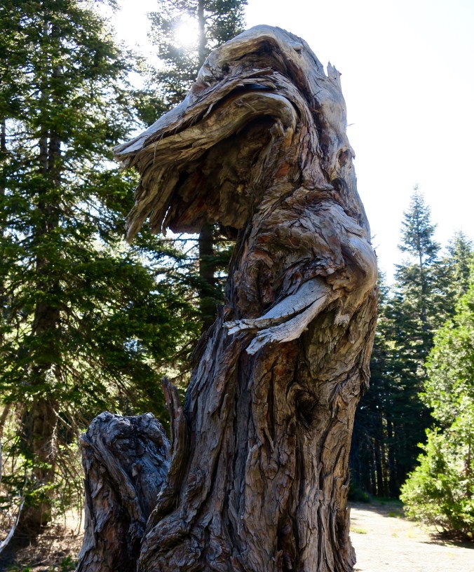 Like Sheep Camp, Donomore Meadows was another area that appealed to early ranchers and miners. Just before we reached this meadow, Peggy and I had stopped to check out a lightning damaged tree and a fawn  jumped out of the grass where its mother had hidden it. It bounded off with a squawk that sounded very much like “Mom!” Deer usually do a great job of hiding their newborns. The color of the fawns, their absolute stillness, and an almost total lack of smell helps guard them from hungry predators. Just like human moms, babies can come early, however! We came down our driveway a couple of days before starting our trip and a doe had dropped a pair of twins in the road. One was spry enough to stand up on wobbly legs, but the other still couldn’t move!