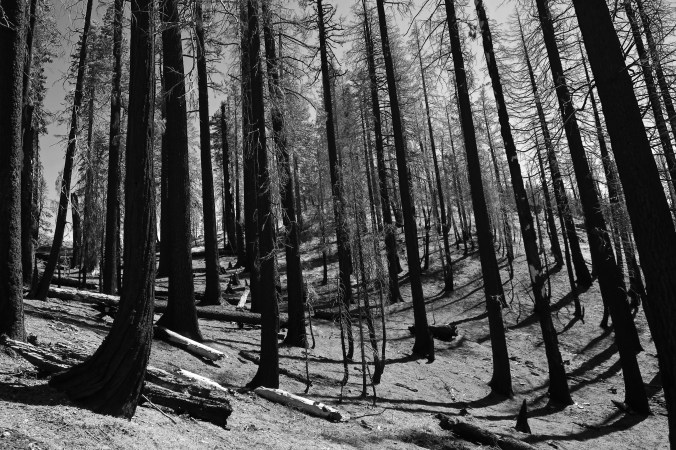 Not too far from Beardog Springs where we met up with Strawdog and camped the night, we began to hike through areas that had been ravaged by forest fires. This was the same series of fires that had forced Peggy and me to evacuate our home last fall. (I’ve rendered it in black and white.) A through-hiker commented to us how ugly it was— I think it was Road Runner who hikes 40 miles a day. Peggy replied she found it interesting and got a strange look. But forest fires are a part of the natural process. A combination of us doing everything to prevent forest fires for the last 70 years and drought/global warming has created the situation where the whole west seems to be burning. (More on this in later blogs.)