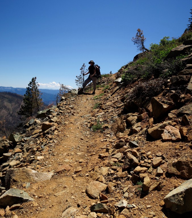 “There’s water down here,” we heard a voice pipe up. It was a welcome announcement. We’d been many miles without any. Turns out, it was Strawman, who we had met a week earlier and given a ride when we were scouting out the Etna area where I am today. We had a happy reunion. Such meetings are typical encounters along the PCT. Strawman, we had learned, navigates from a PCT App on his phone, as many, maybe most, trekkers do. I’m old fashioned and prefer a map.