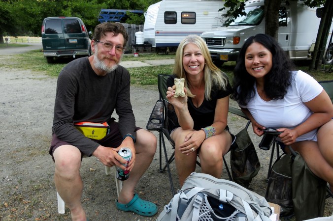 A number of trekkers were staying at the RV campground. We sat around and chatted. Bone, who has been traveling the world since 1977 and is accompanying me on my 1000 mile trek, insisted on coming out and visiting. Mr. O is on the left, Jeanine is in the middle and Julie is on the right.