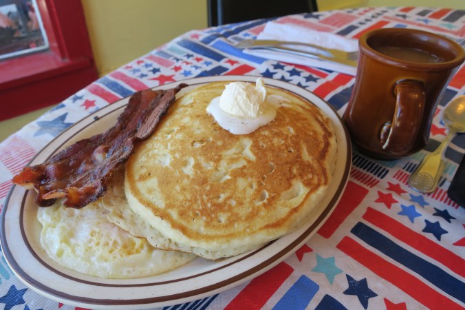 Peggy ordered two of their regular size and could only eat one. The owner told me the challenge pancakes were five times as large!