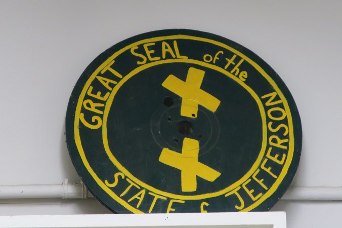 The residents of Seiad are an independent bunch who would dearly love to break off from California and create a separate state. This is the seal. The two x’s apparently mean California double crossed them by not letting them break off after they had voted to do so prior to WWII.