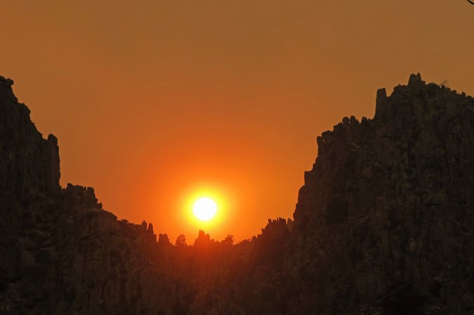 Peggy and I stayed at a KOA along Highway 395 that night. Once again, smoke filled the air. It did make for a rather dramatic photo of the cliffs overlooking the KOA, however.